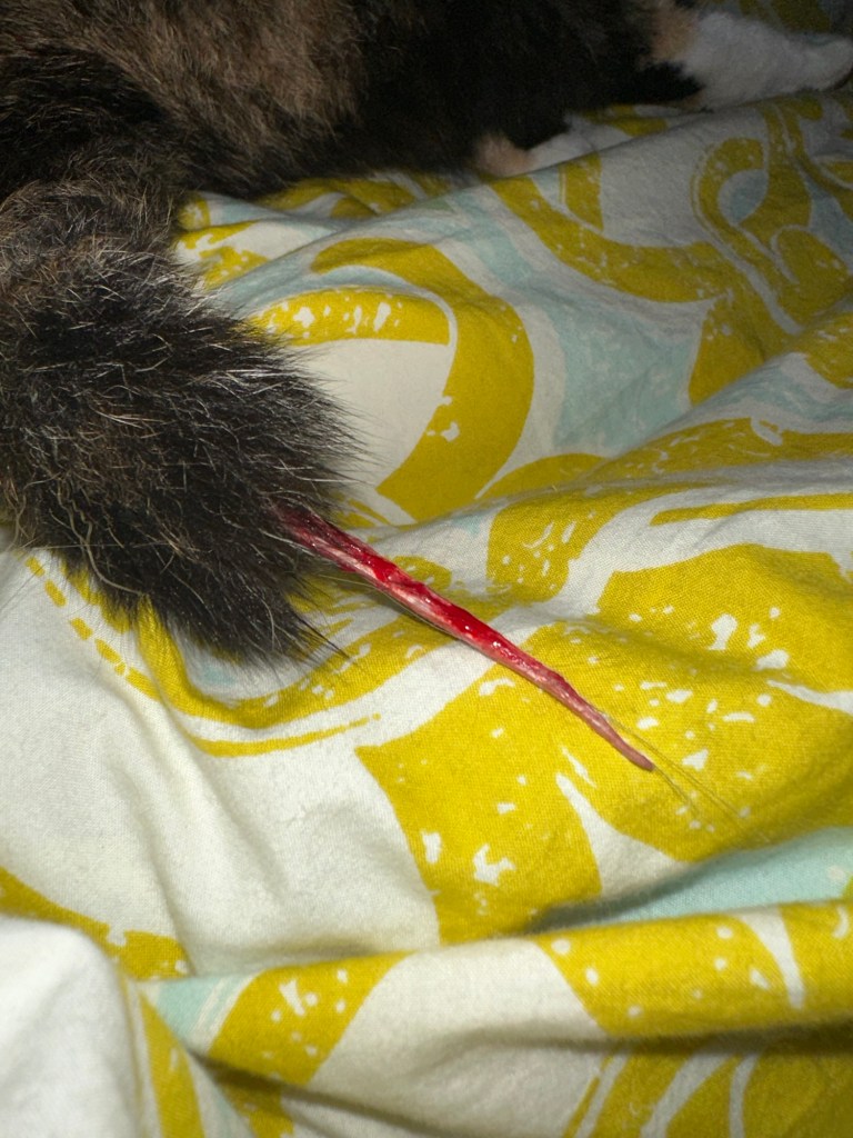 Sammie’s peaceful New Hampshire life ended when the rest of the family, plus the Winter the dog, belonging to Ethan and Sierra, arrived on the 3rd. No matter if she’s home or at the New Hampshire cabin, Sam is always fearful and hostile of Winter. She kept to herself on the windowsill however, until that evening when Seth decided to pick her up and carry her across the kitchen. The rest of us were in the living room visiting and talking, but when Winter saw what Seth was doing she playfully ran over to him, hopping up and down trying to tease Sammie. Sam’s tail was unfortunately just within reach and when Winter snapped at it, she went crazy in Seth’s arms and flew away across the room, all of us adding to the chaos with our own sounds of alarm. Yelling at Seth, grabbing Lucy off the floor, trying to calm Winter down. Sammie ran right at me and then away, leaving two small but deep scratches on my legs. It was a chaotic moment to say the least, and then Sarah said “What is that on the floor??” I looked out into the kitchen and saw a little pile of black. “It’s Sammie’s fur!” Said Seth, and as Sam raced upstairs I saw that the last fourth of her tail was now just a thin pink blood covered bone. The fur was pulled off, along with all the skin. I was so upset. We passed the night with Sam in our room dripping blood from her tail as she restlessly went from bed to floor to table to windowsill and everywhere else, it was very disturbing. Rich and I spent time that next morning of the 4th wiping up cat blood with Clorox wipes because who can bandage and staunch the flow of blood from the end of a cat’s tail? I began calling it her “red paintbrush” but honestly my nerves were on edge what with the house full of family and now an injured best friend cat to feel sorry for.