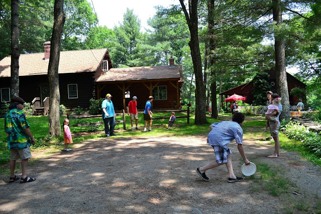 Log farmhouse, I love it!  There was a fun game of Frisbee going on.