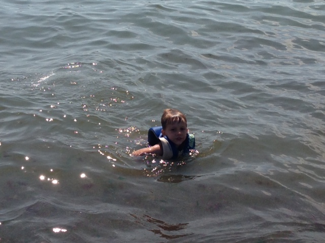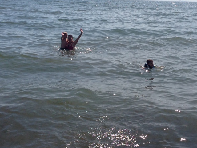 I asked Rich to take some pictures with his iphone, too.  He took this one, I’m in the water with the boys and Sarah, who is very timid, stayed on shore to watch us.