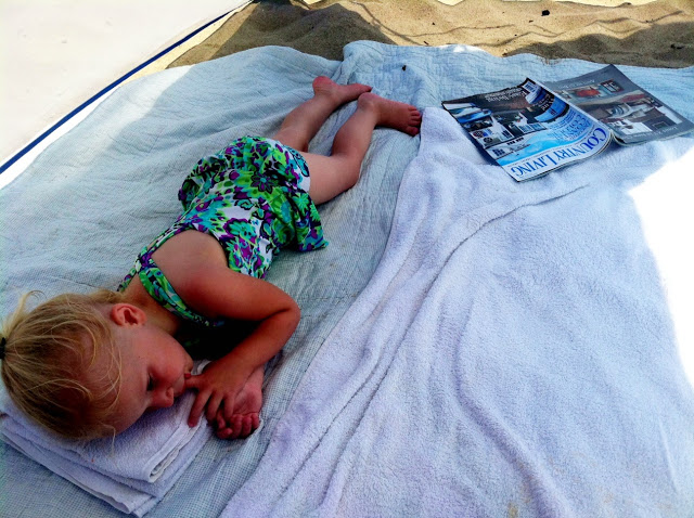 We took a loaf of bread, a jar of peanut butter, and two bags of chips.  We bought drinks at the beach.  I had a few magazines to look at and when Sarah got tired she would come lay down next to me and suck her finger…….we were at the beach for five hours!