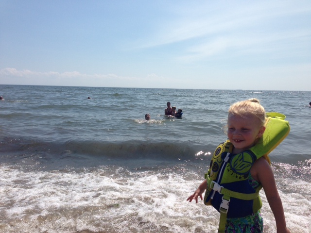 We parked and loaded ourselves with the beach things.  The sand was incredibly hot even with my flip flops on.  Rich got our shade tent up while I slathered sun screen on the children.  There were a lot of people there, but not too bad.  It’s fun to people watch.  The children got busy exploring and swimming.