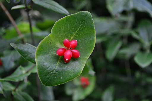 I always intend on purchasing a wild berry identification book.  The ones we found were bright red, in clusters of six, arranged in the middle of an oval leaf.  I would like to know their name.