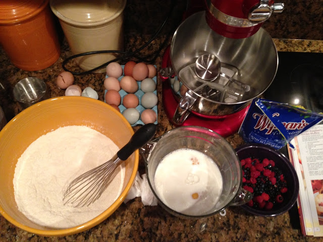 I saved each tiny berry in the bottom of my shirt, held up like an apron. David started giving me his, too. We didn’t have quite enough for muffins so we kept searching and found some blackberries and raspberries, too. While we were outside I went to go check on that wild flower that Bobby Jo thinks might be a type of milkweed. I was going to pick a leaf from the stem to see if it would “milk” but a big huge spider stopped me in my tracks and that was that. Ethan pulled up a Queen Anne’s Lace flower and ate the root from it (after washing it in the pond). We went into the house, Rich got the little ones ready for bed and I mixed up muffins. We ate them warm while watching TV. Cozy.