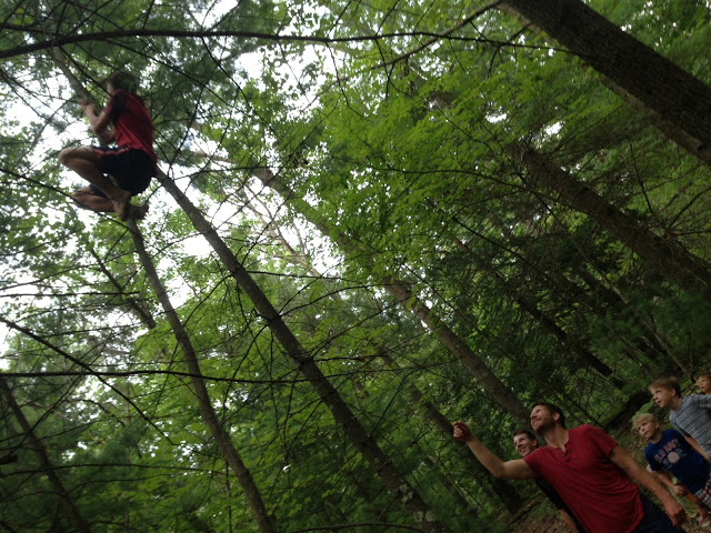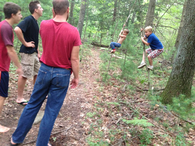 After dinner I did a quick clean up and we all went out into the woods for a family walk. Ethan and David had found blueberries (small, wild ones) growing and they wanted to show them to me. The boys practiced shimmying up trees and I held Sarah Joy’s hand. She is rather Piglet-like (from Winnie the Pooh) and must always have a hand on me, she cries if I start walking and we aren’t connected. After a while, longing for relief from this small but important burden, I passed her to her Papa and would you believe, it turned into a Situation. She would not stop crying for Mama to take her back, even though I was just there, walking with the group, but not attached. Rich wouldn’t hear of it and stopped to talk to her seriously about Being Brave. The interesting thing being, she has been like this since she was a tiny baby! I would carry her in my arms until I got tired and when I passed her to her loving Dad, she would look at me, lean toward me, and wail……she has never “won” but still hasn’t settled herself to be content with poor Rich. Only mama will do for the Ultimate Comfort.