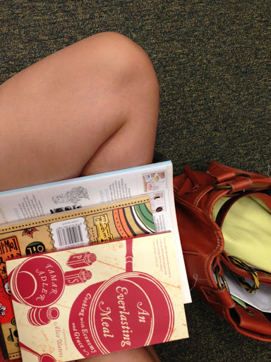 | sitting cross legged like a kid on the floor at Barnes and Noble |