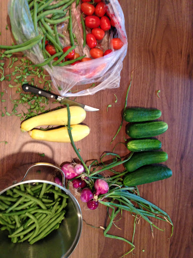 When we got home from the bookstore, I was suitably inspired to make a thoughtful dinner vs. leftovers and/or sandwiches (which is a fine option for lazy summer days, but my family was getting hungry for something better). I had poached a couple of packages of chicken thighs Sunday night, so I took those out and diced them. I used the chicken as the meat in a big pot of Spanish Rice, instead of the typical hamburger. Rich said he liked it better that way. All the children like Spanish Rice. I also made a side of freshly cooked green beans from Carl’s garden stand down the road, a little bowl of seasoned tomatoes (also from Carl) and sliced and vinegared cucumbers (same).
