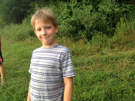 I saved each tiny berry in the bottom of my shirt, held up like an apron. David started giving me his, too. We didn’t have quite enough for muffins so we kept searching and found some blackberries and raspberries, too. While we were outside I went to go check on that wild flower that Bobby Jo thinks might be a type of milkweed. I was going to pick a leaf from the stem to see if it would “milk” but a big huge spider stopped me in my tracks and that was that. Ethan pulled up a Queen Anne’s Lace flower and ate the root from it (after washing it in the pond). We went into the house, Rich got the little ones ready for bed and I mixed up muffins. We ate them warm while watching TV. Cozy.