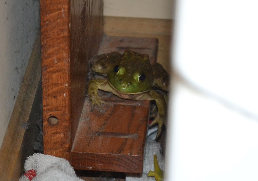 A few days ago, I found a big bullfrog in my laundry room.  I was about to throw in a load of laundry and out of the corner of my eye, I saw it sitting silently right in front of the washing machine.  I was so surprised to see him that I admit, I did scream a little.  It promptly hopped between the wall and the washer and sat some more.