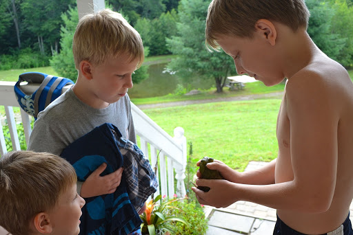 There are two ponds on our property, which have afforded the children plenty of opportunities through the years to catch, play with, observe, and lose in the house many different varieties of creatures.  A few years ago, Rich and I woke up hearing noises under our bed; it was a turtle.  A few months ago, there was a snake lost in the house for an entire weekend.