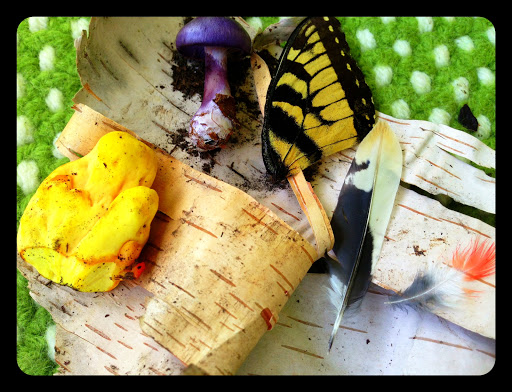 My two nieces and a nephew are here today and we all went for a walk in the forest (11 of us).  It’s a preliminary fall type of day, bright and clear and dry.  Contentment in my heart.  Sunshine in our smiles.  I brought home nature bits in my hand.  Naomi had the first find; a tiny feather with an orange tip.  She ran to me and I said, “Oh can I keep it?” and she jumped up and down smiling, “Yes!”  Then, I found a blob of a yellow mushroom oozing out of a fallen tree.  I was surprised by the color and kept it.  Then, another feather!  I have a nature journal and I glue feathers into it.  I have never seen feathers like the ones we found today and can’t wait to add them to the journal.