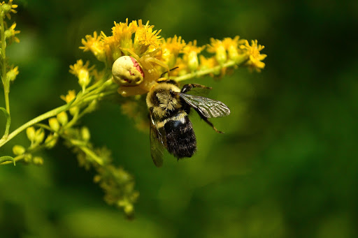 A tiny yellow spider, gripping a helpless bumble bee around the neck.  On goldenrod.