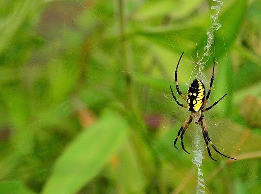 This is a common garden spider, commonly known as the black and yellow garden spider, writing spider, or corn spider.  I am familiar with these from childhood and often came very close to running through their webs as I played across the road in the blueberry patch.  I hated them, they filled me with the creeps and their webs always seem to be right at my waist, impossible to avoid.  They still give me a shiver, but as I was reading about them this morning I found myself fascinated.  One interesting fact is that they eat the middle of their web every evening (perhaps because of tiny particles and insects which have been caught during the day) and spin a new one in the morning.