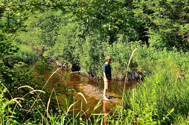 My son in the stream.  He was watching a frog.