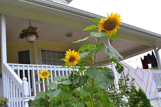 I went out to gather the eggs this morning and took this picture of the happy sunflowers in bloom.  They are growing right by the front door steps and I’ve been guarding them from the boys all summer.  It looks like there are three but there are really only two.  The first one was chopped off by a fighting boy with a stick and it grew back with two flowers instead of one!