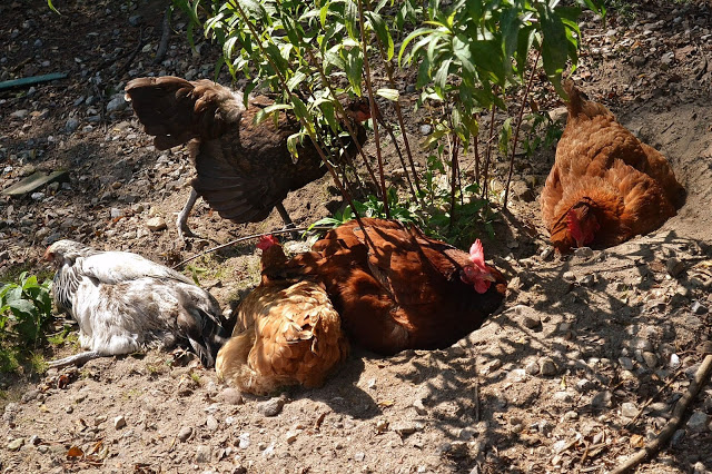 The hens were in the middle of bathtime when I arrived to get the eggs.  I love to watch them dust bathe, they scratch and fling dirt all over their feathers.