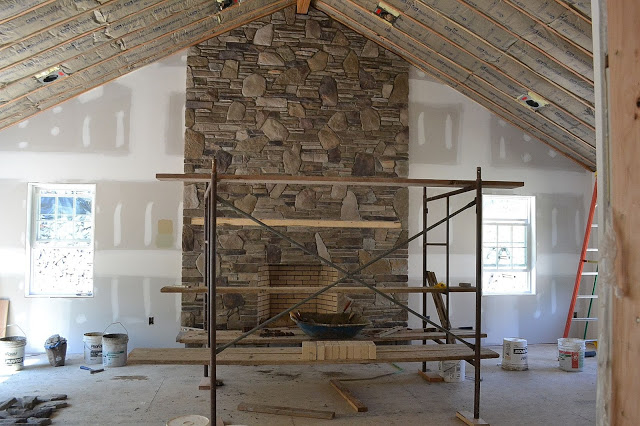 The masons are finishing up their work on the fireplace and I can’t wait until they’re done because the dust! is awful…but they are doing such a great job and I love the stonework.