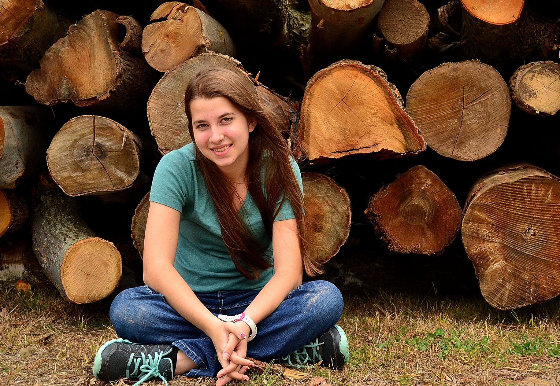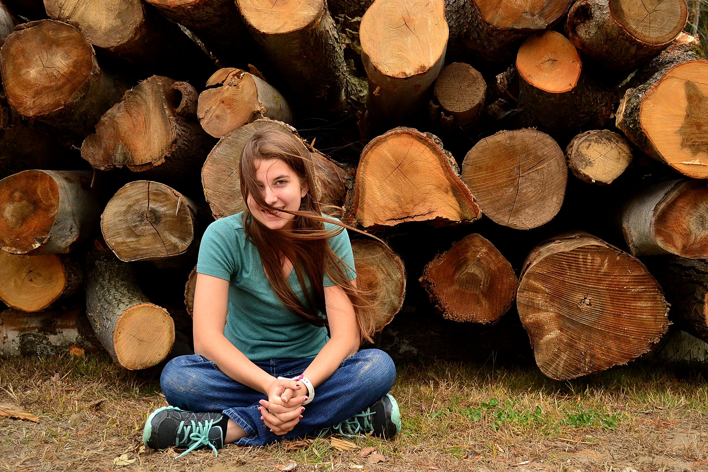 Our new addition is almost done, so close to being done that I’m full of joy with the prospect of decorating it, and moving in.  We are just about there, my friends.  We have a fire place!  Rich is a man’s man through and through, but I can see the little boy in him as he sets about building his woodpile and carrying in the logs.  He’s so cute when he carries in the logs.  He had a delivery of them (trees, practically) unloaded on the lawn (which is now going to sit there and make me nervous until it’s chopped, because I’m afraid the children will climb on them and make them roll down and flatten someone) and I used the beauty of the *dangerous* logs as a backdrop to take a couple of pictures.  Pictures?  But of course!