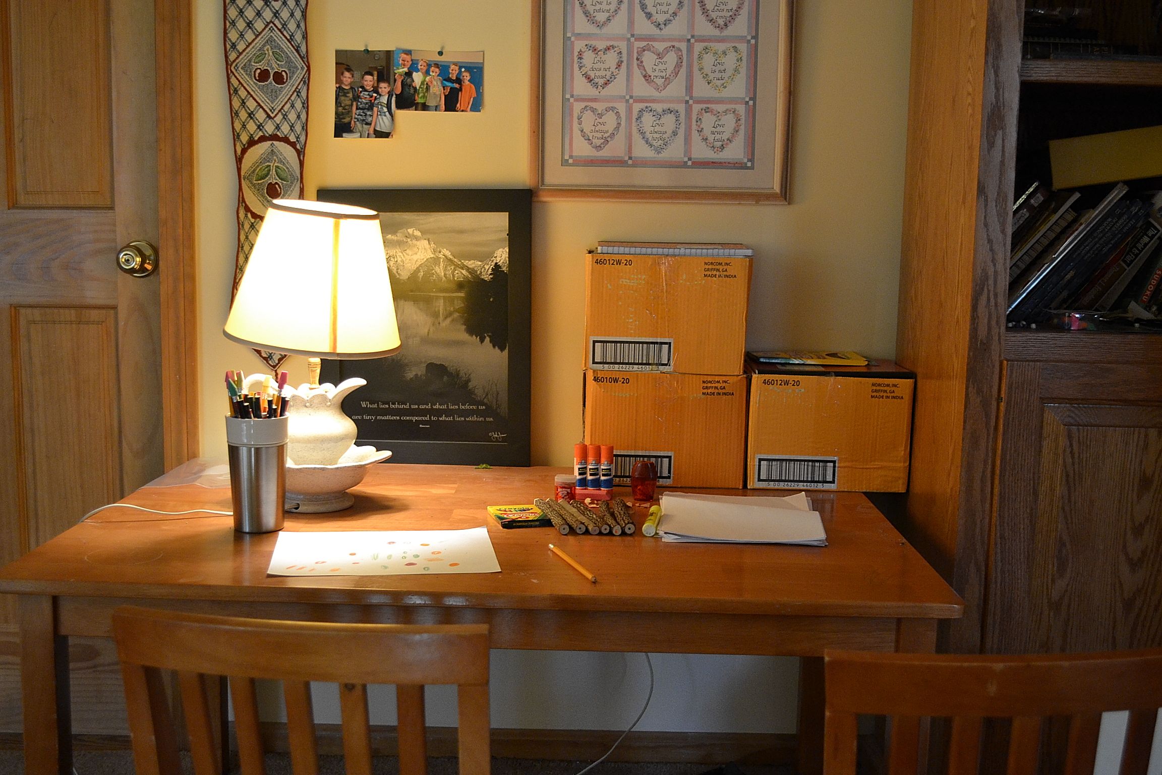As soon as he arrived home from school yesterday, David set to work.  He cleared off the small table upstairs and then hunted down all the colored pencils in the house he could find.  He chose his Dad’s coffee mug to put them in.  That done, he set out to find a lamp.  He found one in his sister’s room and took it to his table to plug it in.  Now he had light to work by.  He got some pure white paper, sat in his chair…..and worked for such a long time.  His brother Caleb had to beg him to go out to jump on the trampoline with him. Then right back to his table he went, until it was nighttime.