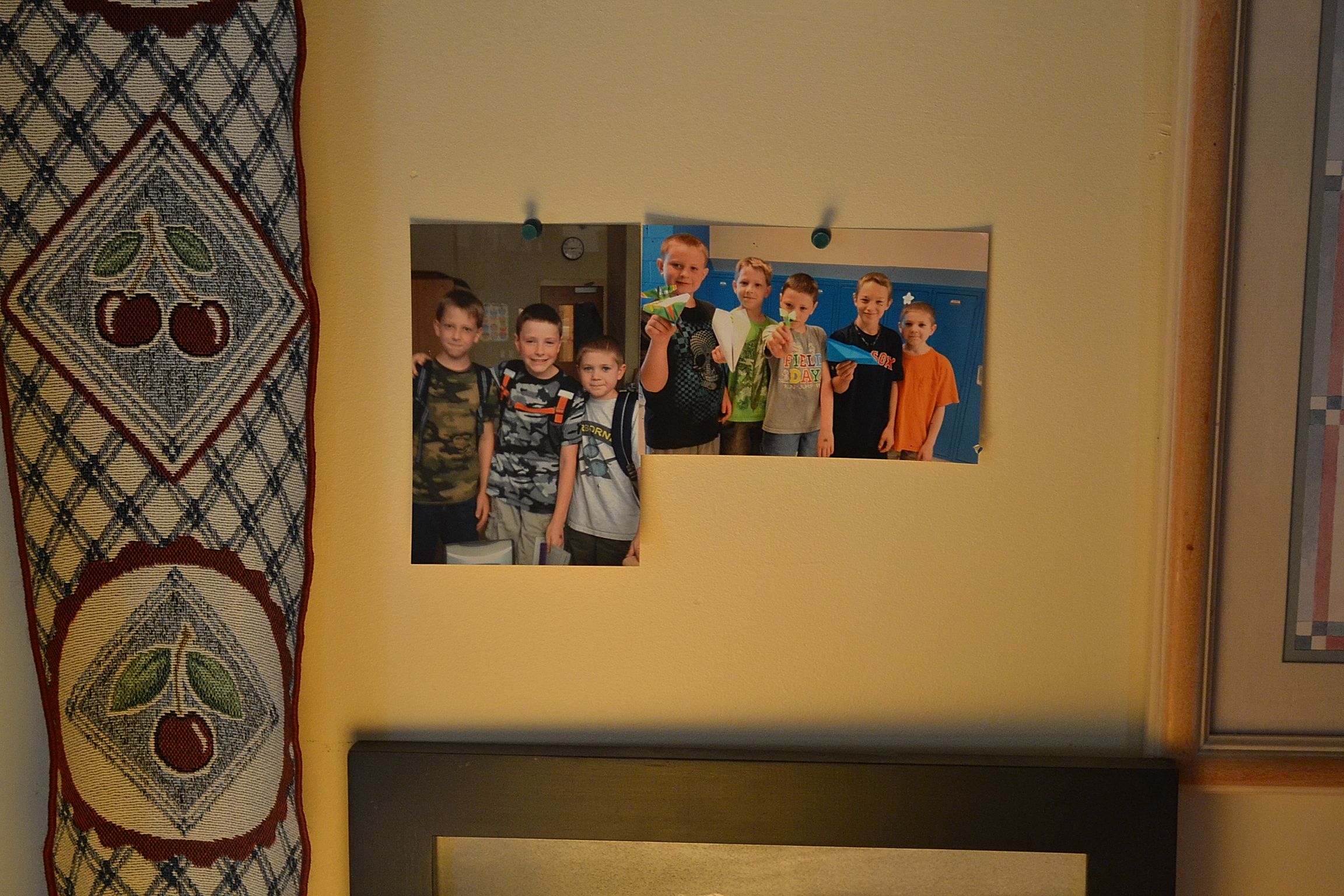 He hung up pictures of his club from last year.  He loves these pictures.  His teacher took them, and gave them to him.