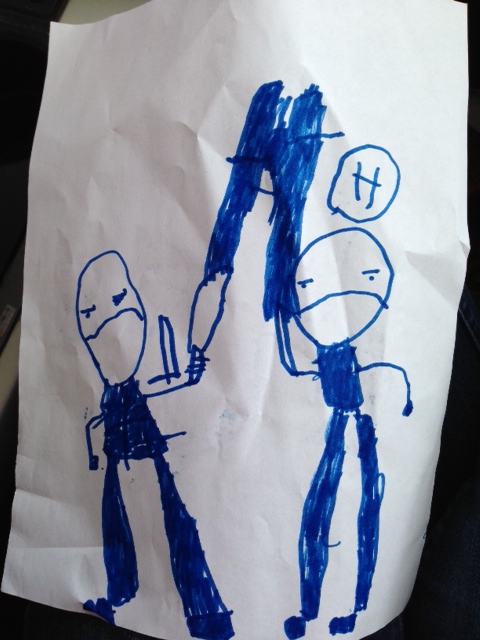 Seth, our youngest boy (of which we have five) has been heart achingly cute this weekend (and always).  He did many cute things which will not be mentioned here today.   However, the two blue guys must be mentioned.  Rich and I had to run errands on Saturday morning and Seth came along, bringing with him white paper, a drawing book, and a blue marker.  He is an energetic sort of person, lighthearted,  jolly,  fun, sparkling with LIFE, so to see him concentrating back there in his seat with a marker was too much.  Then, to see his drawing!  I delight.  The bendable arms!  The hands like balls!  The long frog-like mouths!  And the speech bubble!  He only knows one word, and it is “H”.