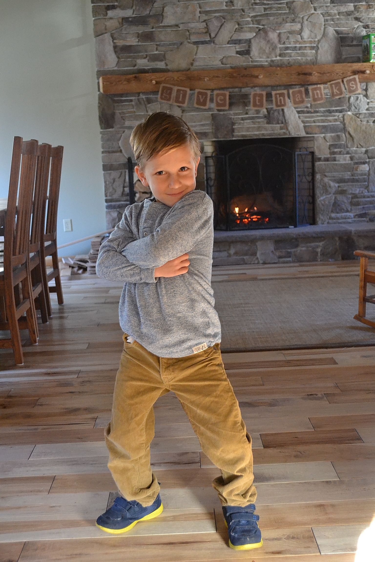 Sunday morning.  Oh, Sunday morning how you challenge me.  But dressing Seth, who was properly scrubbed with a white washcloth of all blue marker remnants, was a satisfaction.  He was clean.  He was clean AND stylish, wearing clothes which were neither too big, nor too small, nor ripped, nor mismatched.  It called for a short photo shoot.