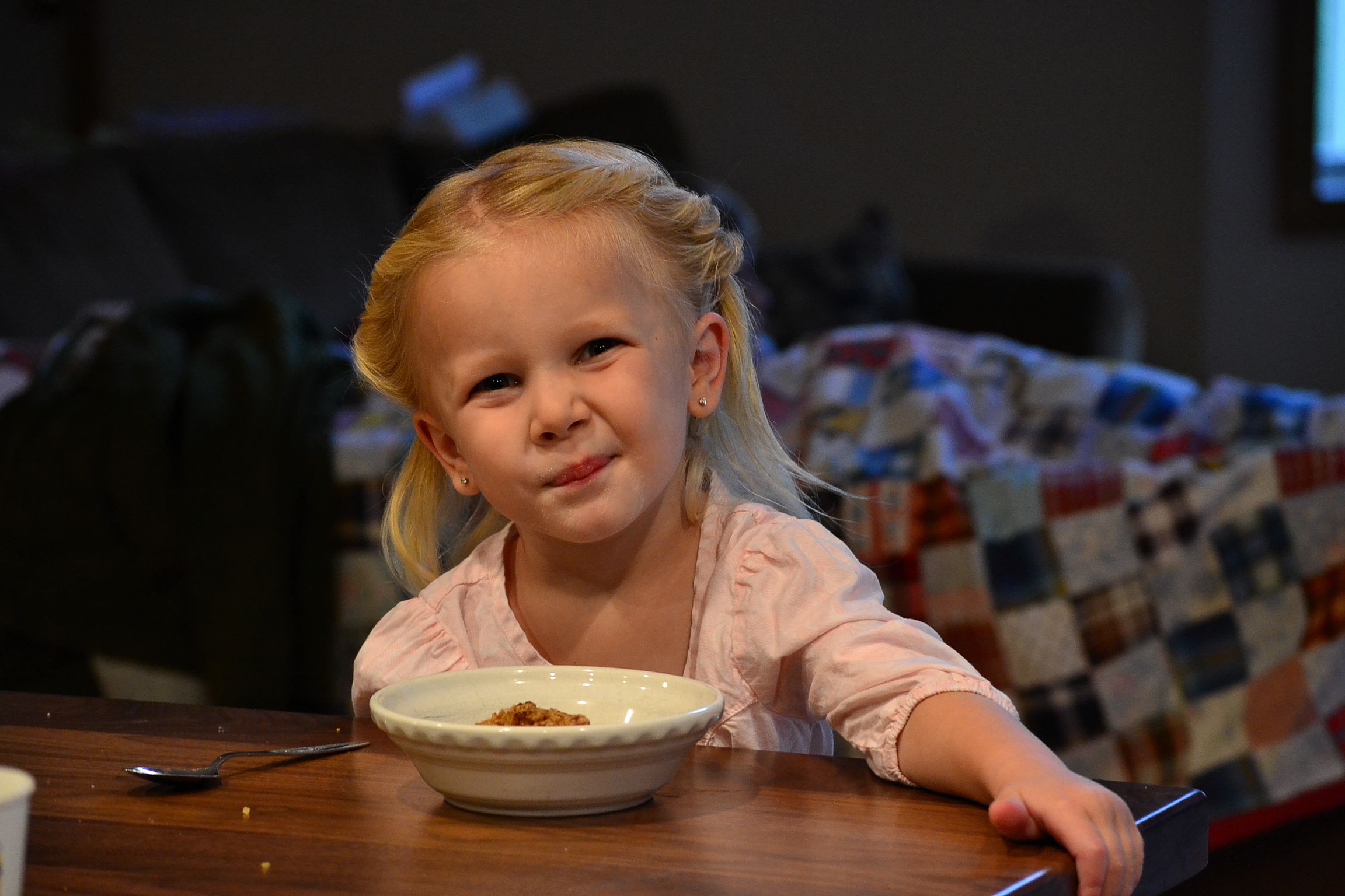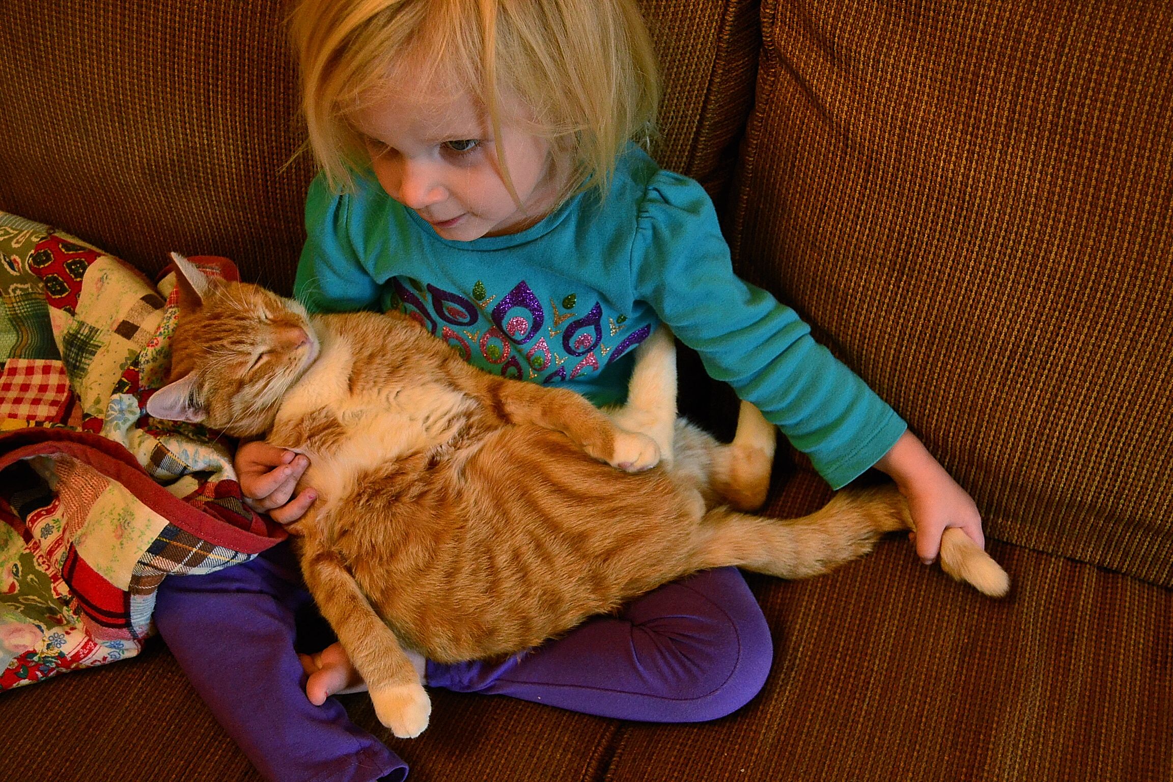 Oh yes, I want that.  The trains on the floor ready to be played with, marker on the toddler hands as a sign of creativity, spending an extra hour in pj’s because we can, and it’s comfortable.  A cat curled up beside me and Sarah with her blanket.