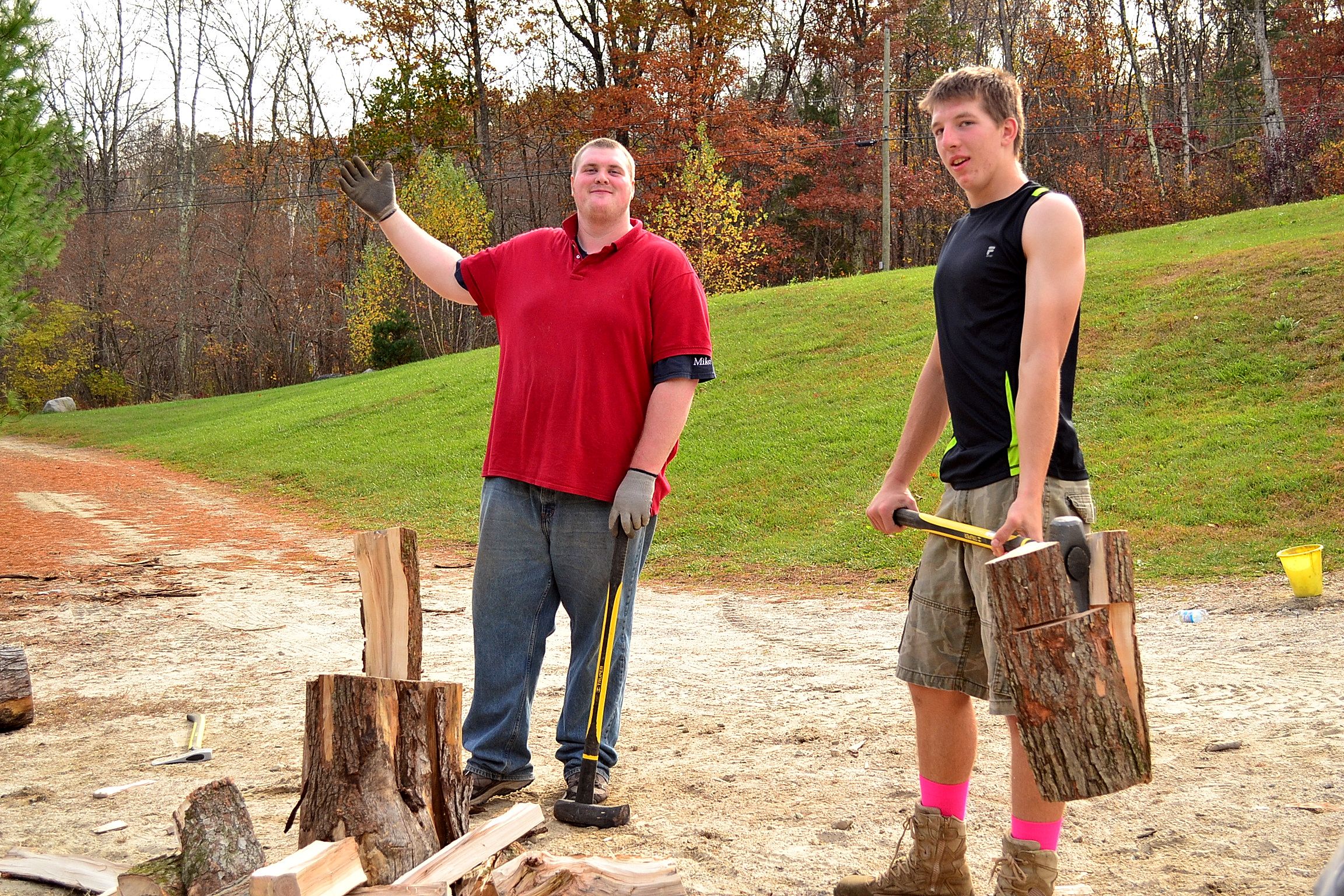 I love my husband so much.  He’s been extra busy this week with work.  He had a long meeting last night, so important that one of the executives, who had tickets to the World Series final game, had to miss it for work!  (so sad)  Anyway, this man of mine grew up on a farm and at the end of an axe, chopping wood for his Dad…..and he was thrilled to order logs to be chopping for our own fireplace this year.  In typical fashion, he ordered way more than necessary, and I’m sure this amount of wood will last for several years.  In the meantime, he now has his boys at the ends of the axes.  His boys, plus Mike.  (who is like family)