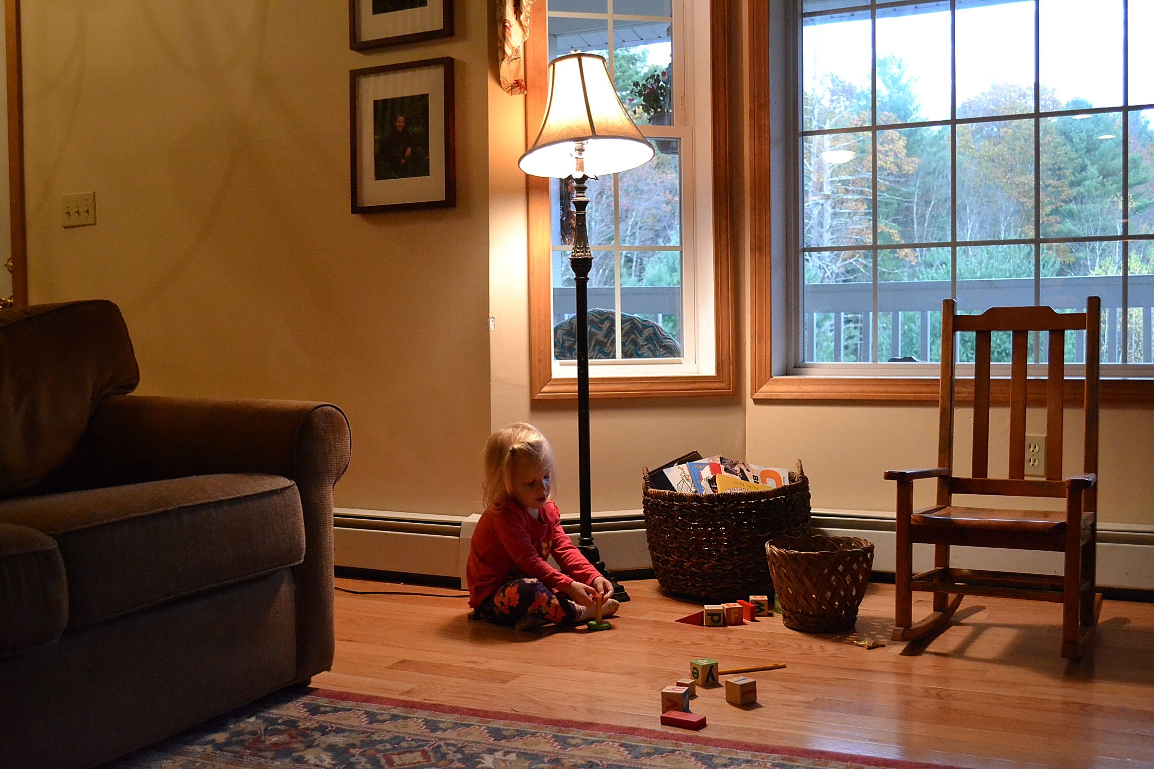 I have been organizing toys and as soon as the blocks were all in one basket rather than five toy boxes, they were played with again, under lamps, on the floor, by the book basket and the little rocking chair from Grandma and Grandpa.