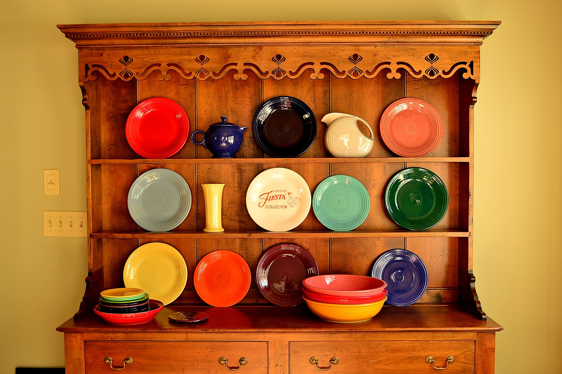 Playing with my dishes!  I’m slowly working my stuff out of the storage room and into our new space.  I washed a pile of fiesta plates that I’ve had tucked away for a few years; a vintage red, cobalt, rose, and turquoise, a discontinued evergreen, and yellow.  Also, my “genuine fiesta collector” plate that I ordered years ago from the old Betty Crocker catalogue.