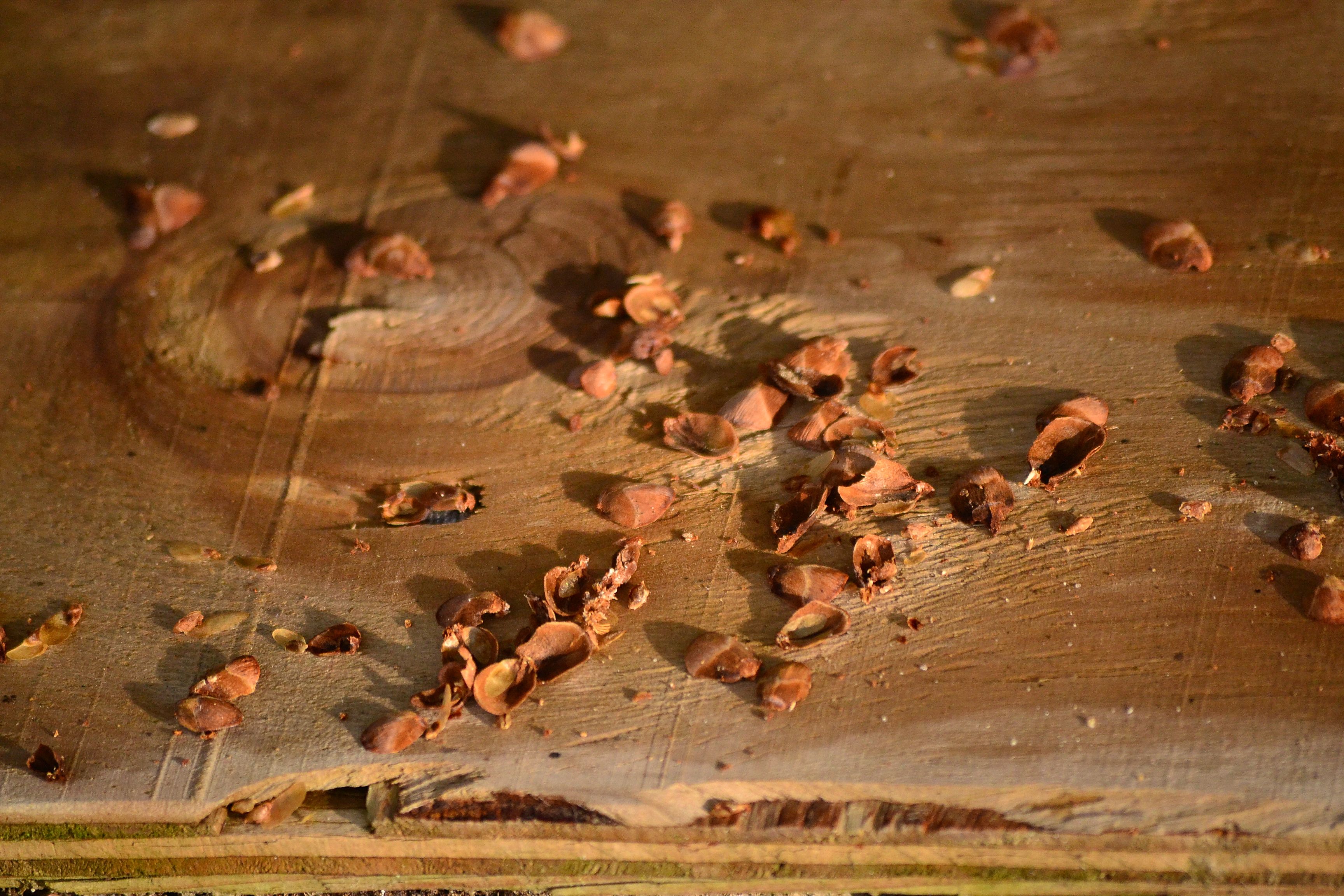 Under the tree there was an old wooden raft that Ethan had made for the pond; I found bits of pinecone left behind from the birds’ feasting.