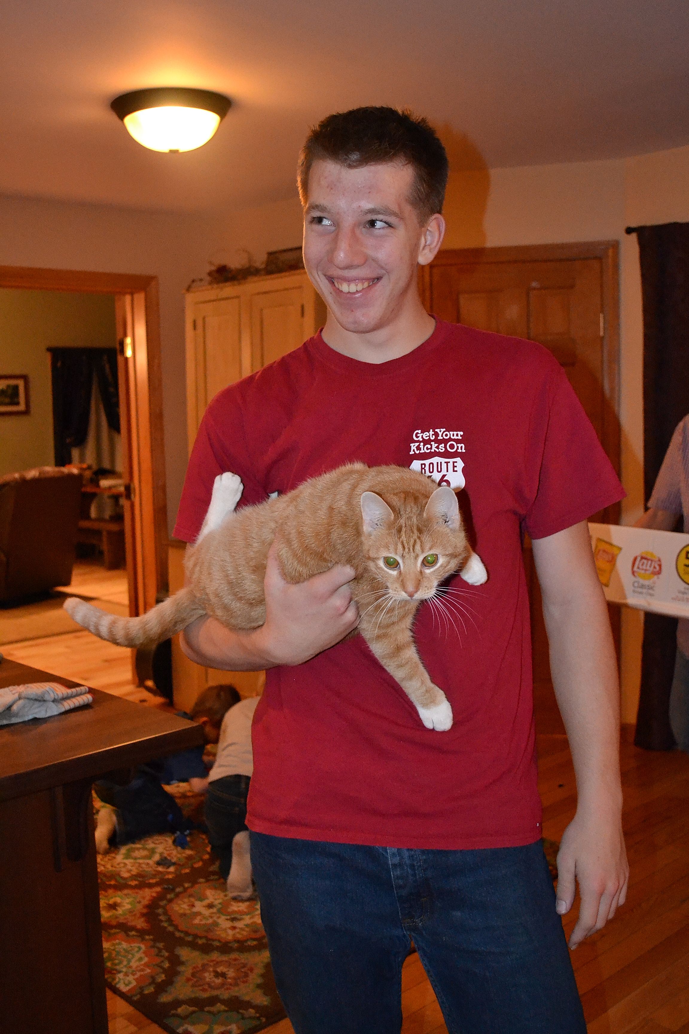 Jacob loves to torture our cat Sherlock by holding him whether he wants to be held or not.