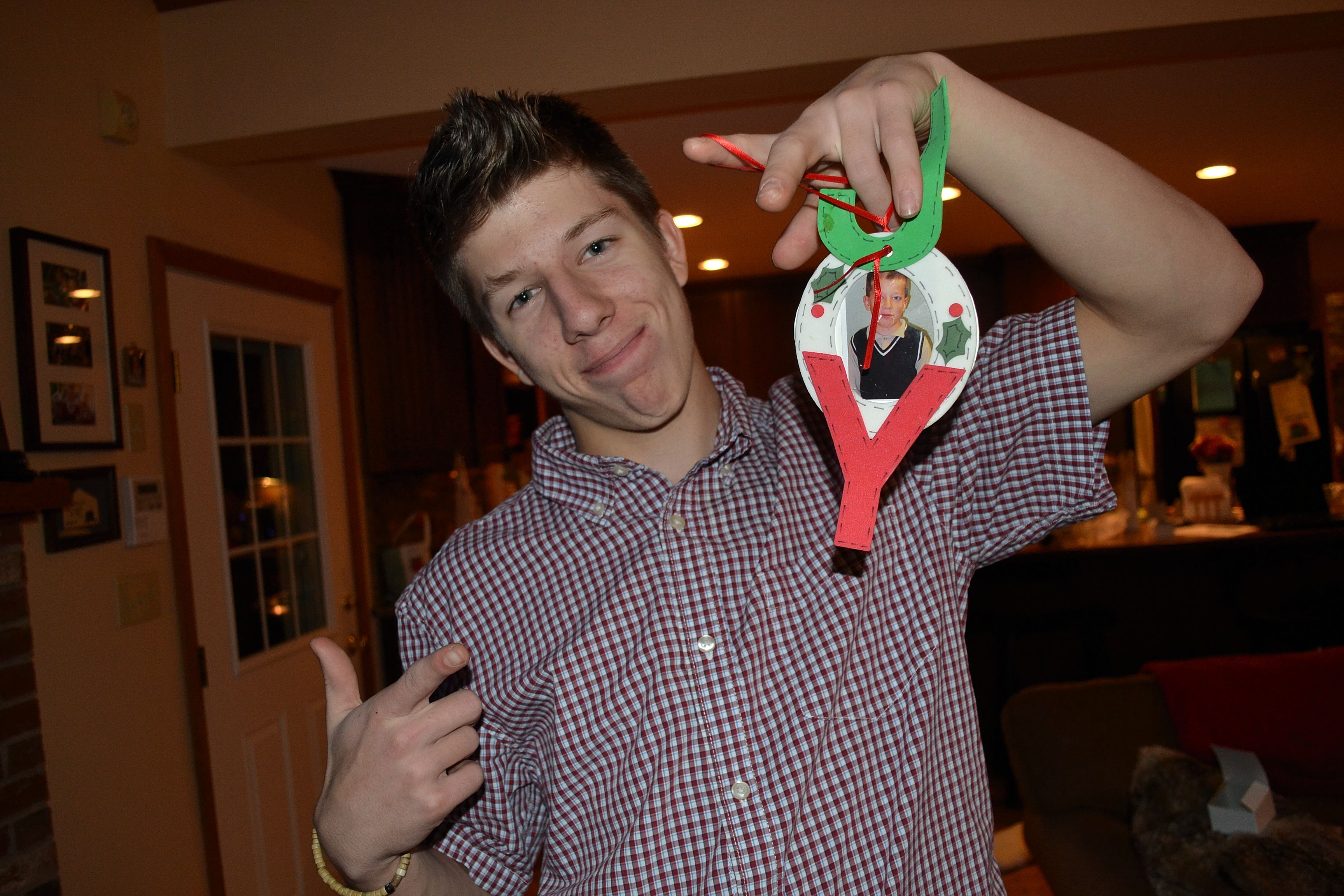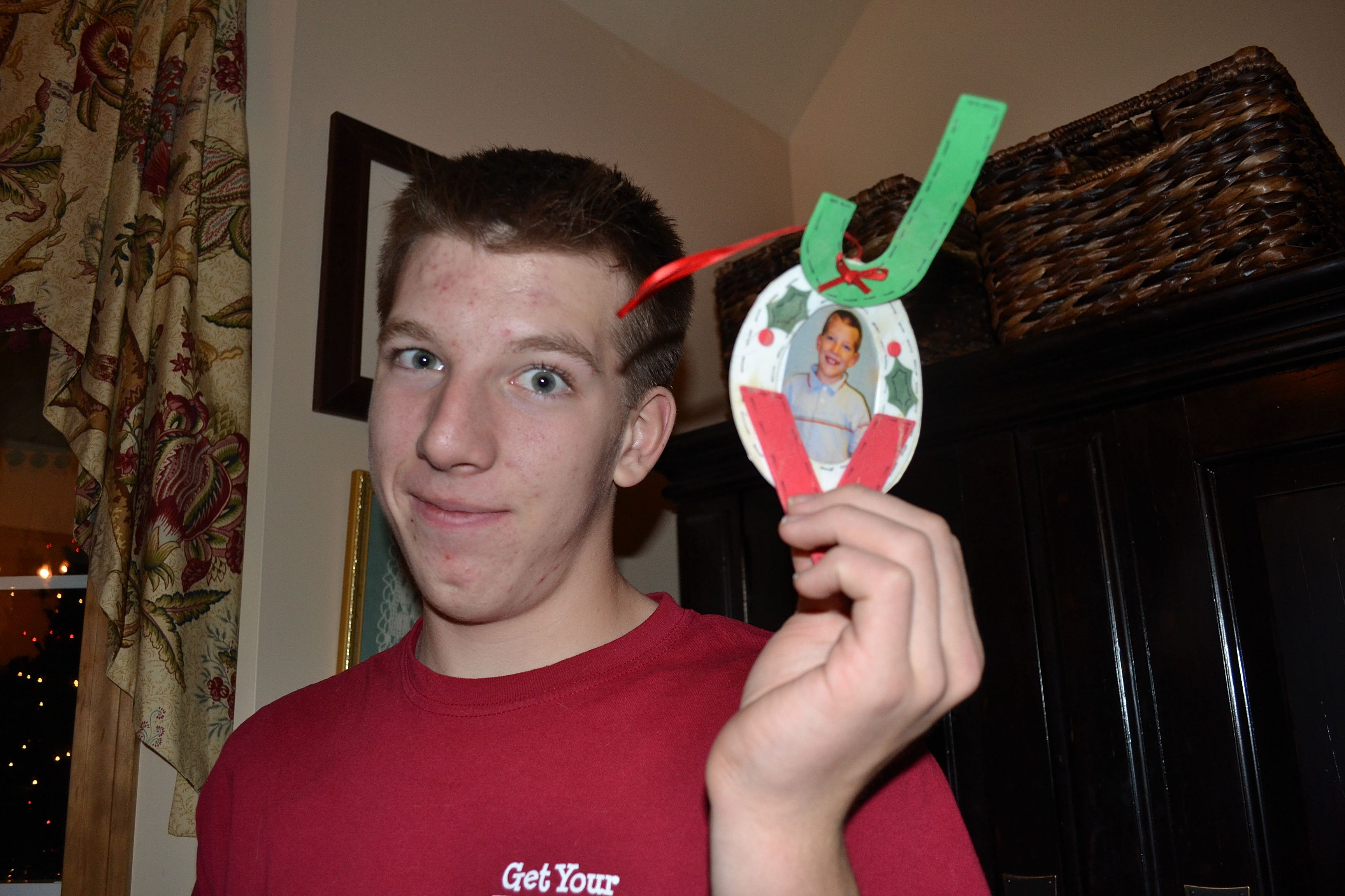 Jacob posed with an ornament he made years ago, with a picture in it, of his younger self.