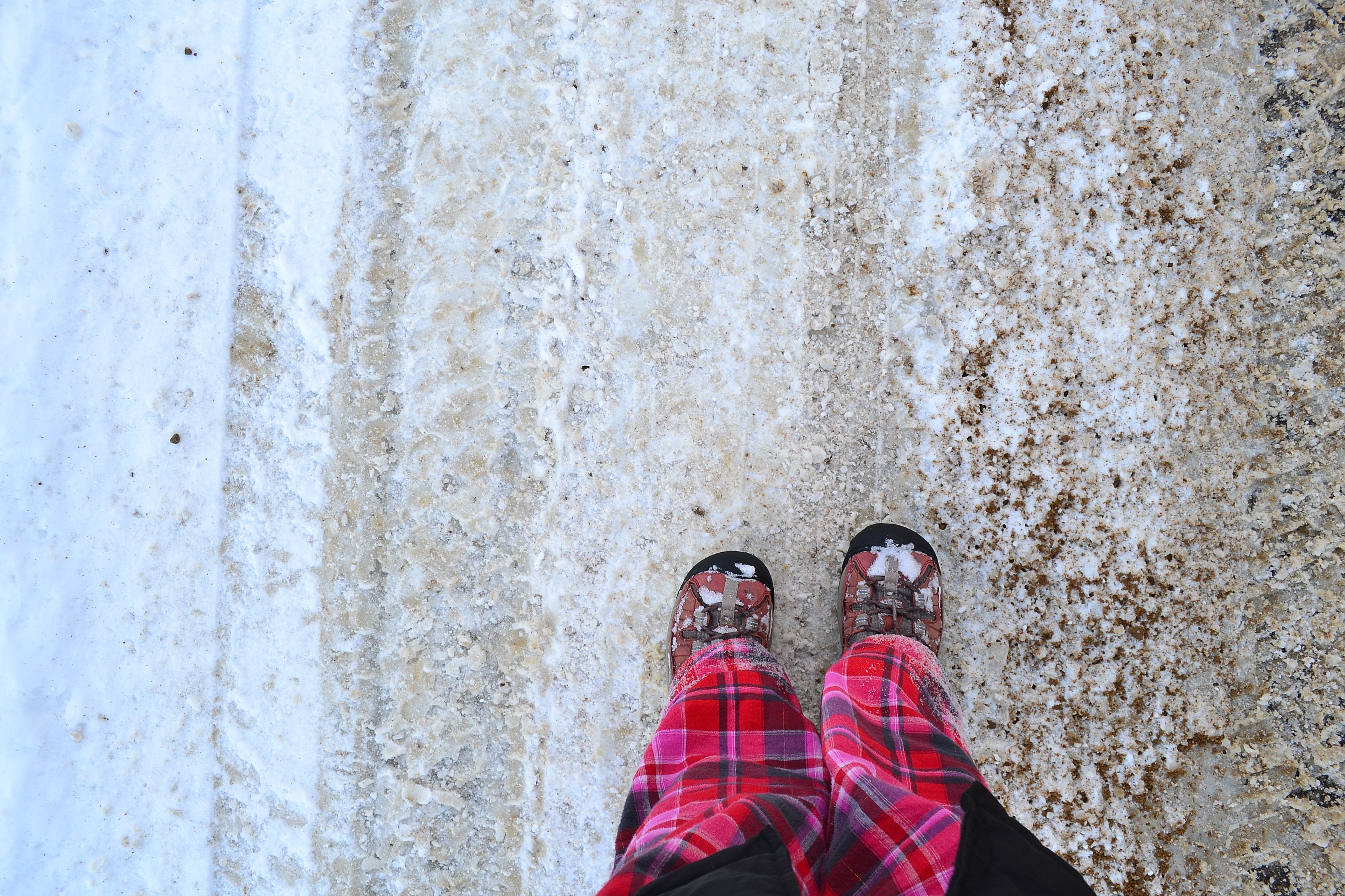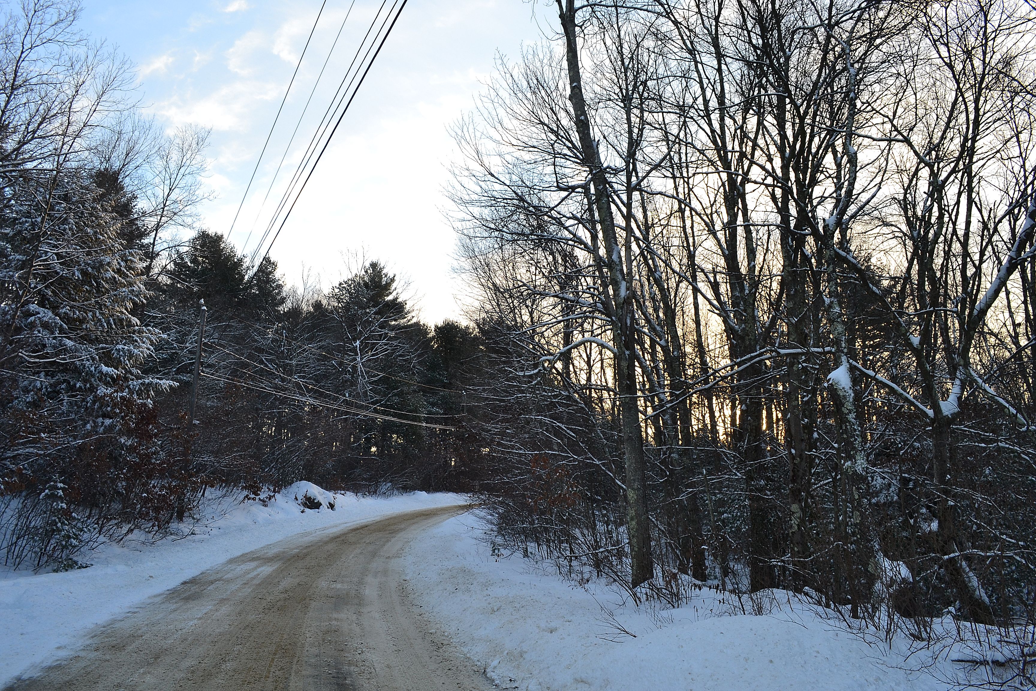 (snow covered road that always makes me think of donuts; my pj’s and boots)