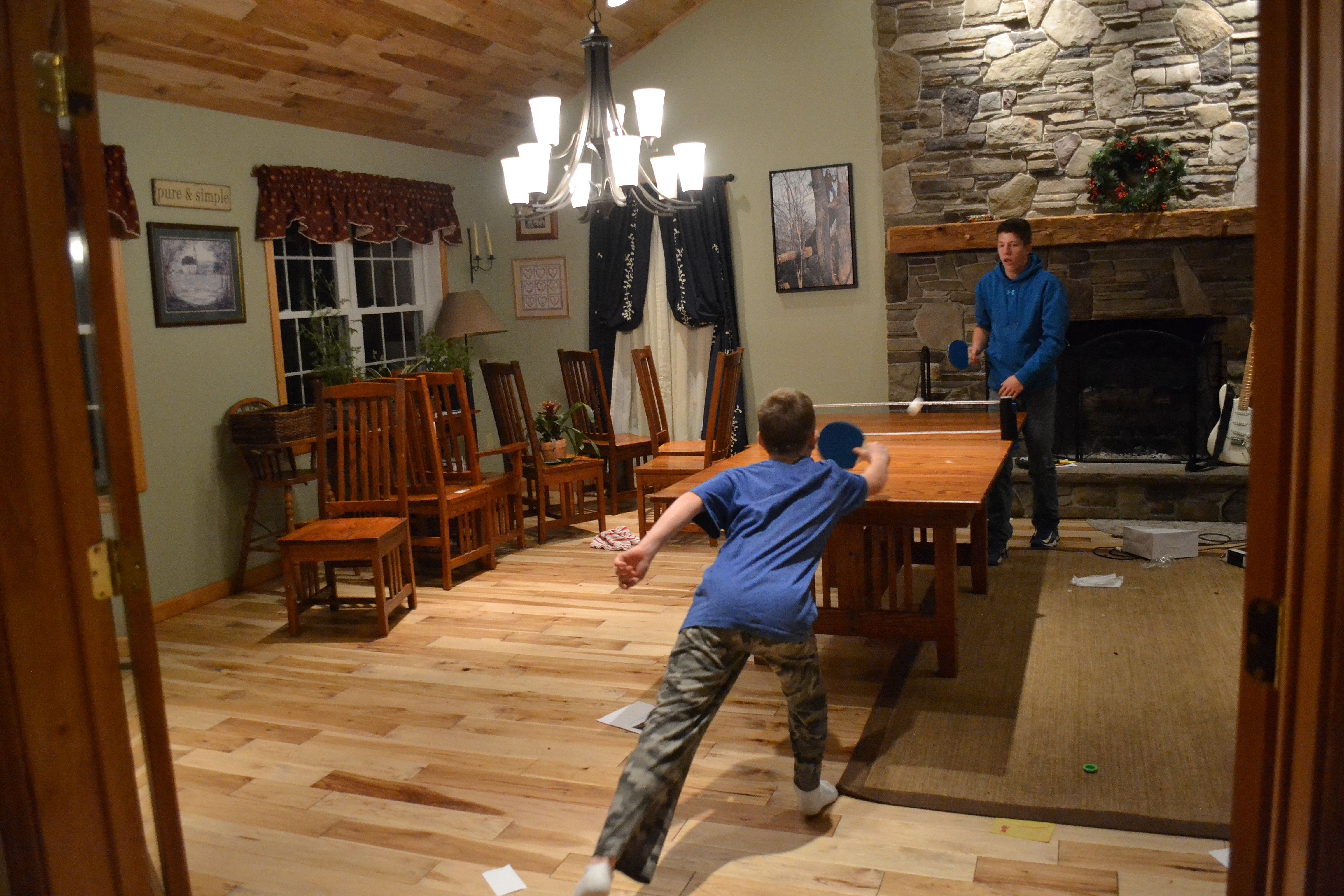1. I can’t tell if it’s David or Caleb from behind, but I’ll bet those socks are slippery on that wood floor. I think he’s at a disadvantage. I say let him put on some shoes, and give him a ‘do-over’. 🙂