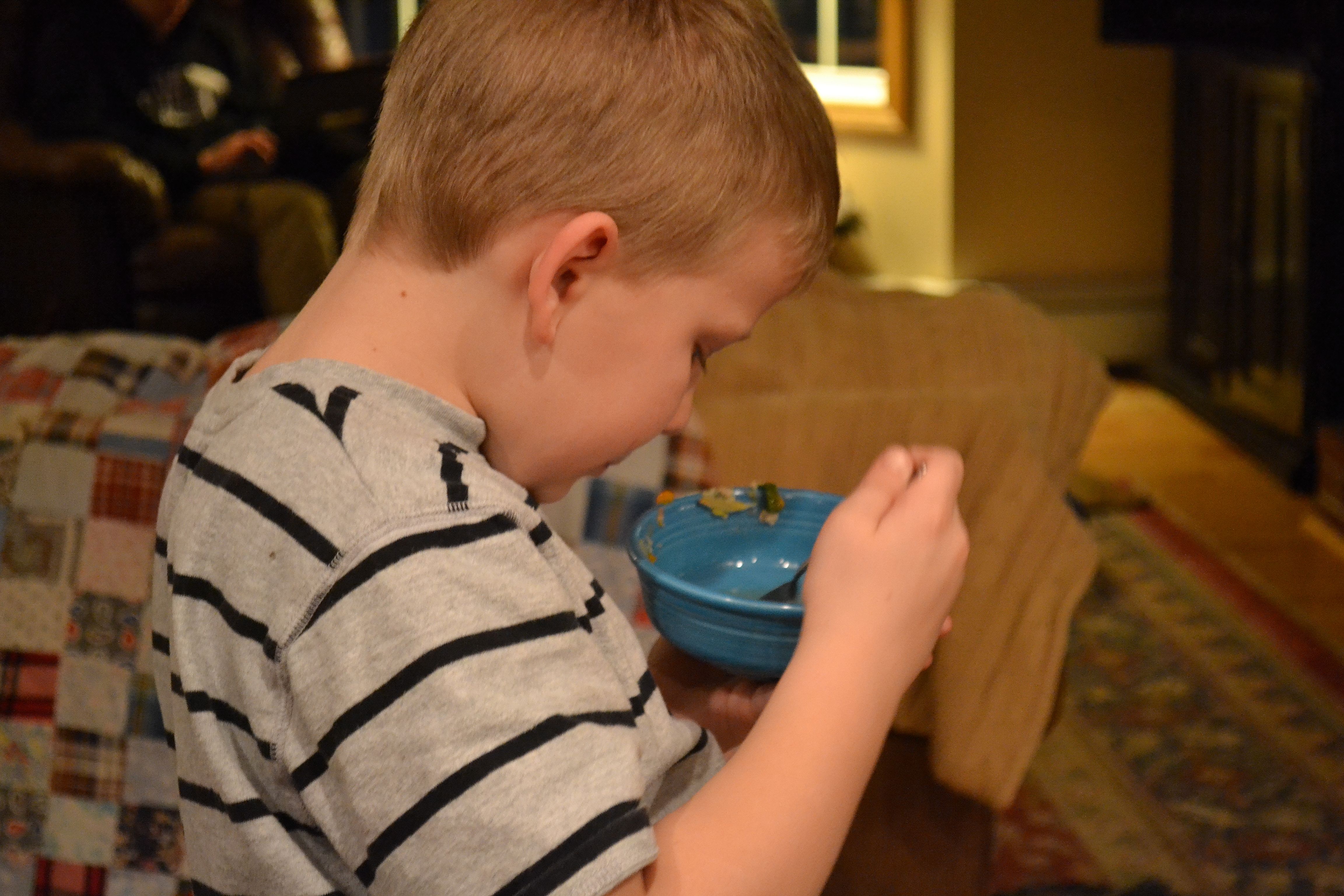Darling Caleb, scraping up the last of his (third) bowl of soup made by mother.