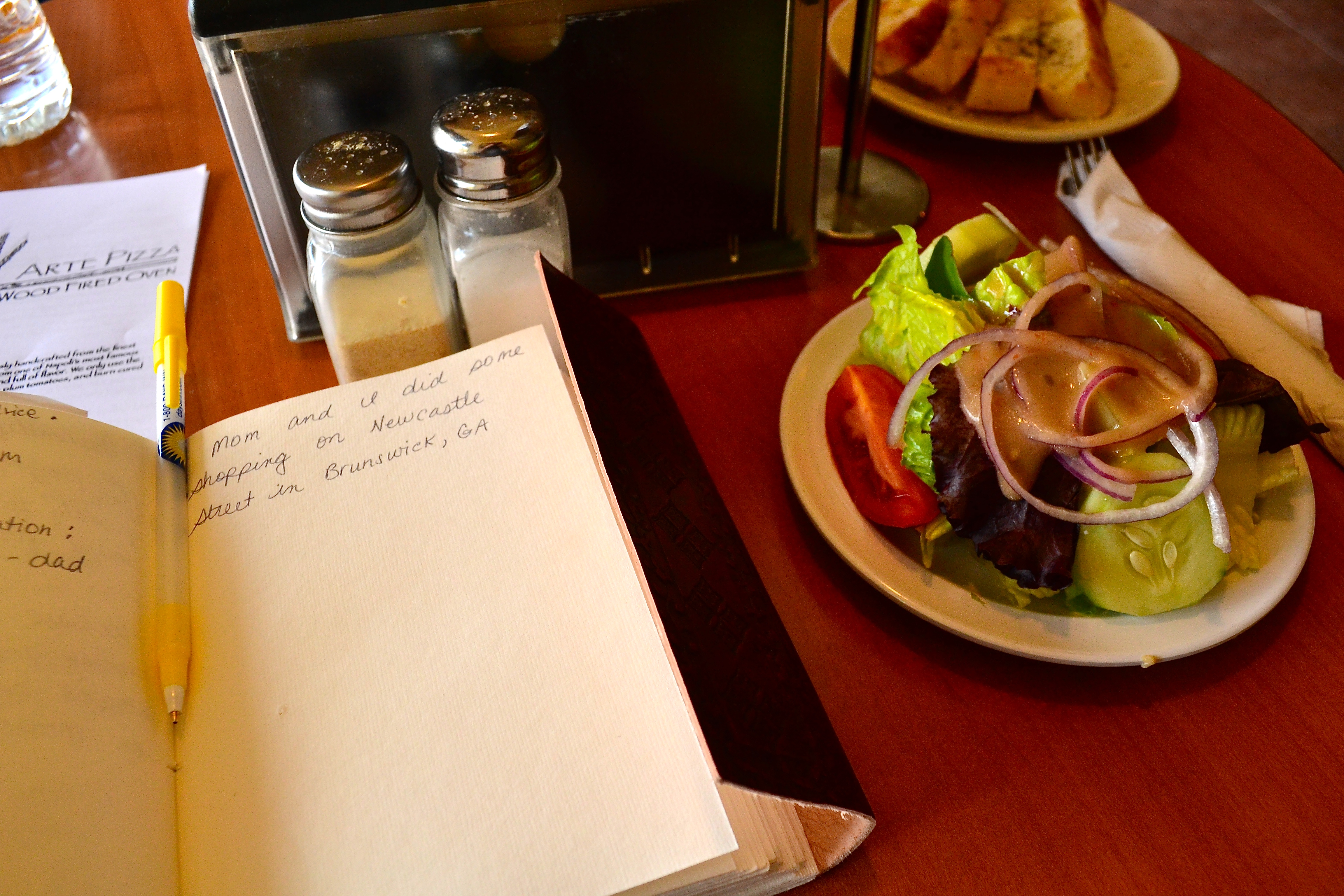 We can now heartily recommend Arte Pizza on 1518 Newcastle Street in Brunswick, GA.  I had the house salad and a meatball sandwich, made with thick slices of meatball, lightly sauced with a wonderful tomato sauce, with a basil leaf.  It was served steaming hot on an artisan roll.