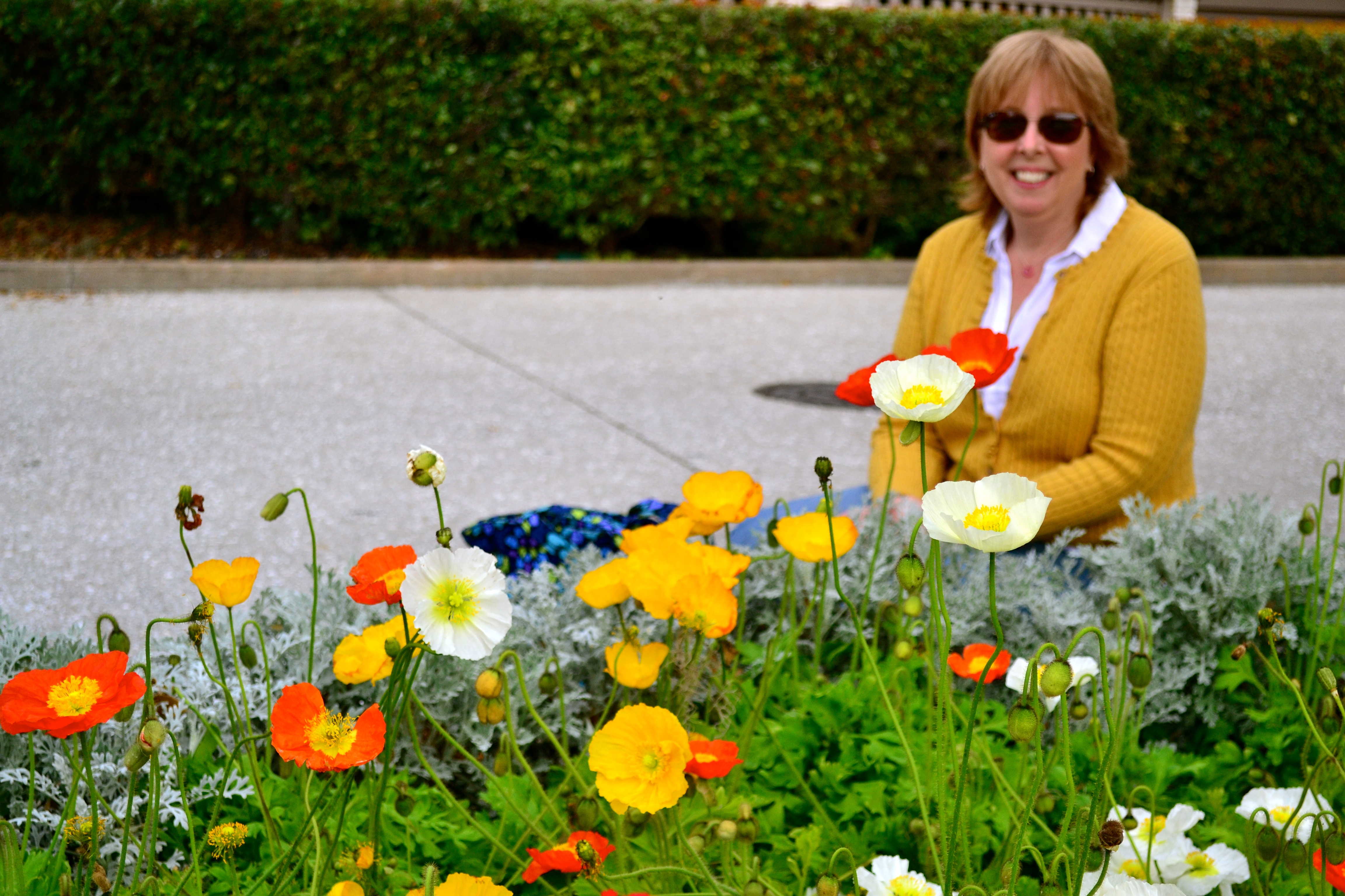 Mother in the poppies, looking like a poppy in her yellow sweater.