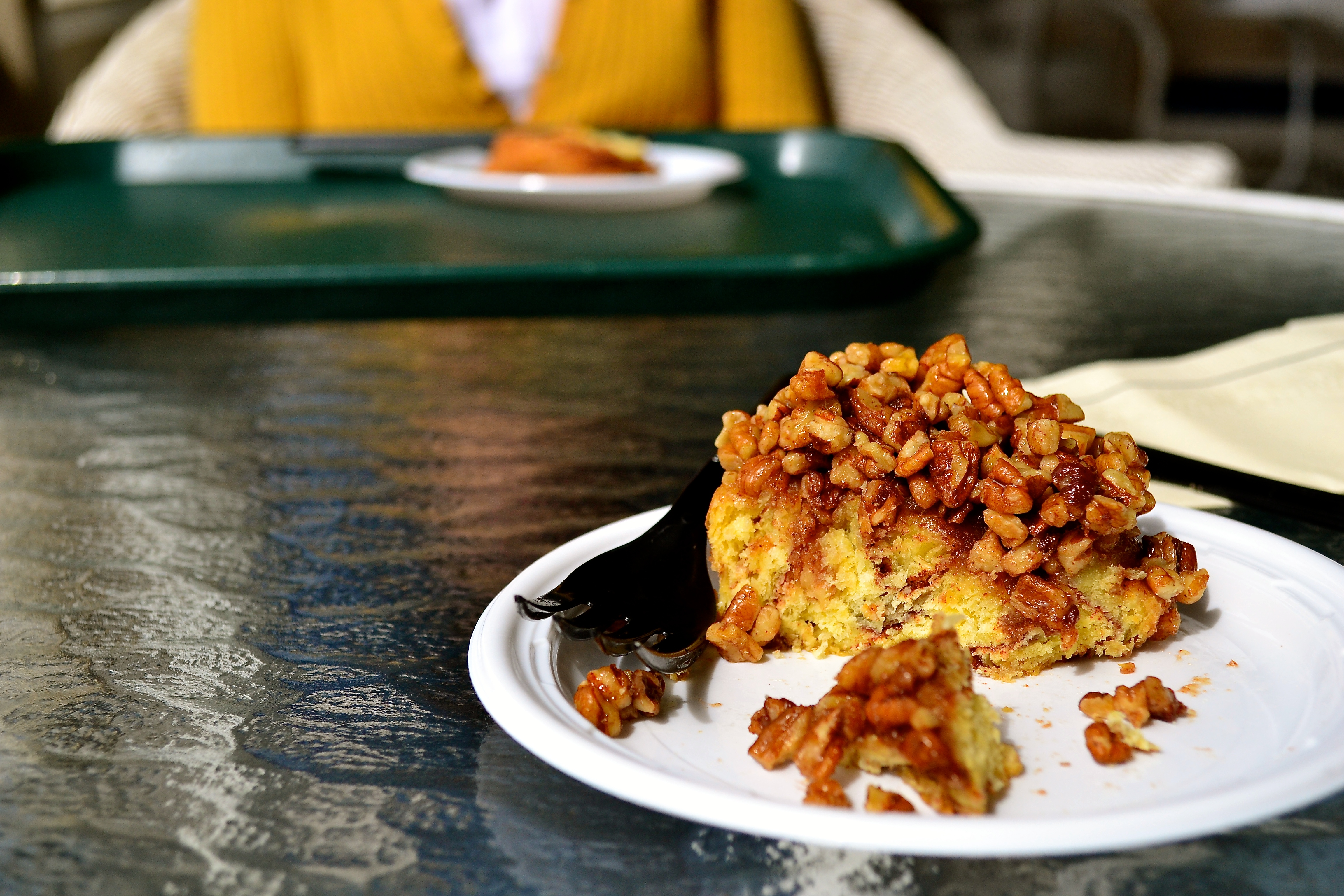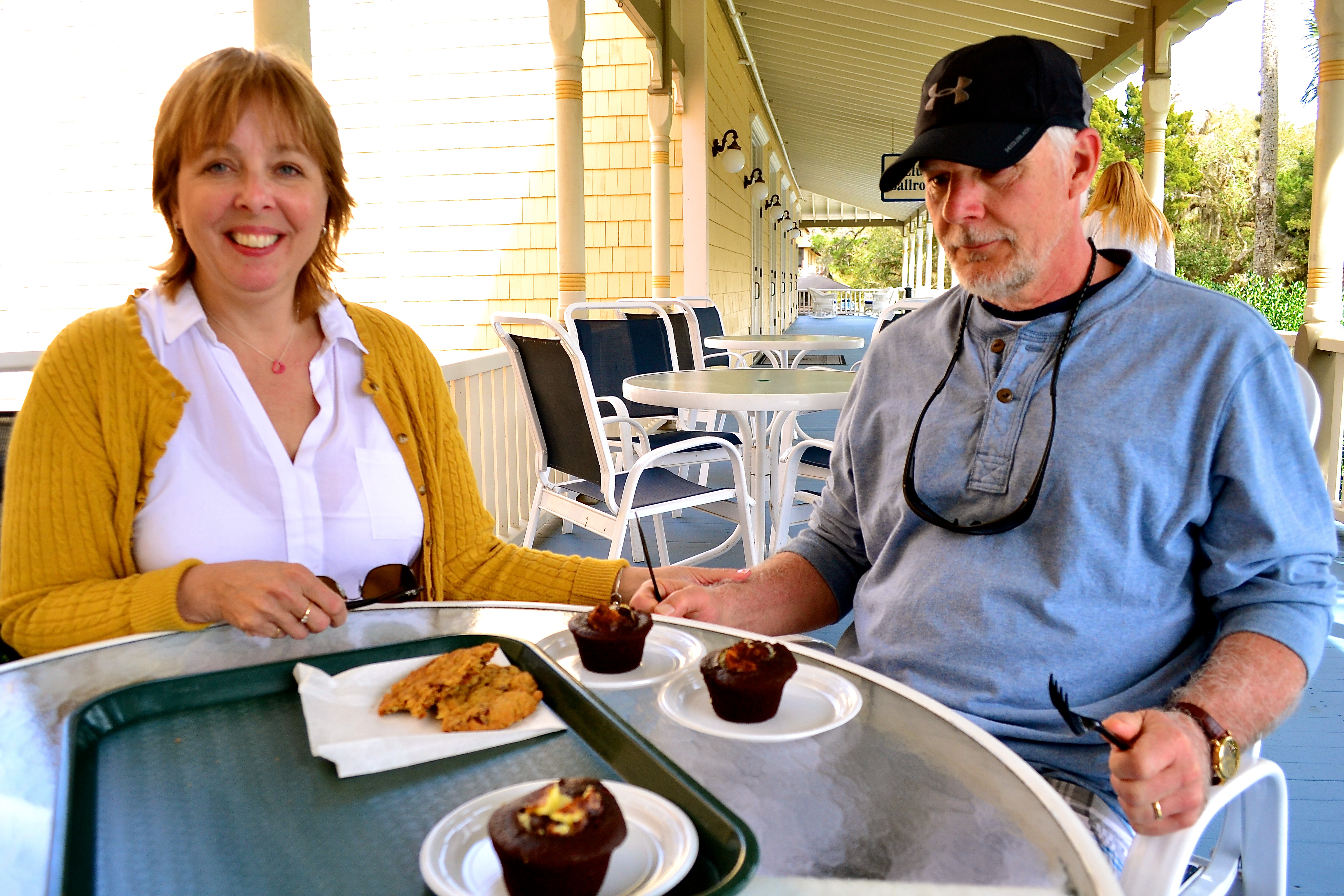 Then we headed back to the club for dessert at the cafe. They had Dad’s favorite black bottom muffins and because he had given us gifts, (as you will see in a moment) Mom and I bought him two muffins. I had one, as well (a dense chocolate muffin with a little scoop of cheesecake topping and chocolate chips in the cake) and Mother had a big oatmeal cookie with dried cranberries.