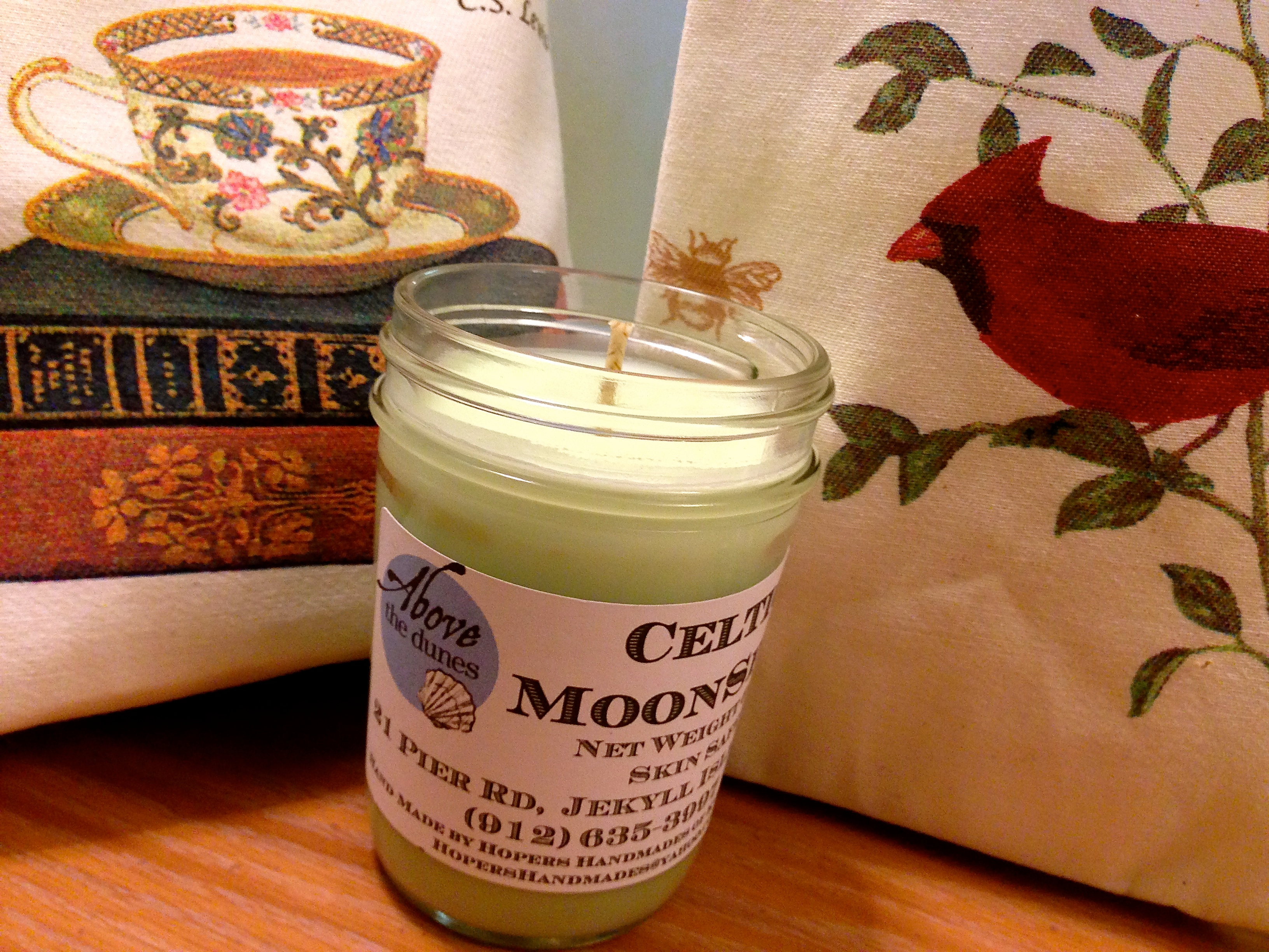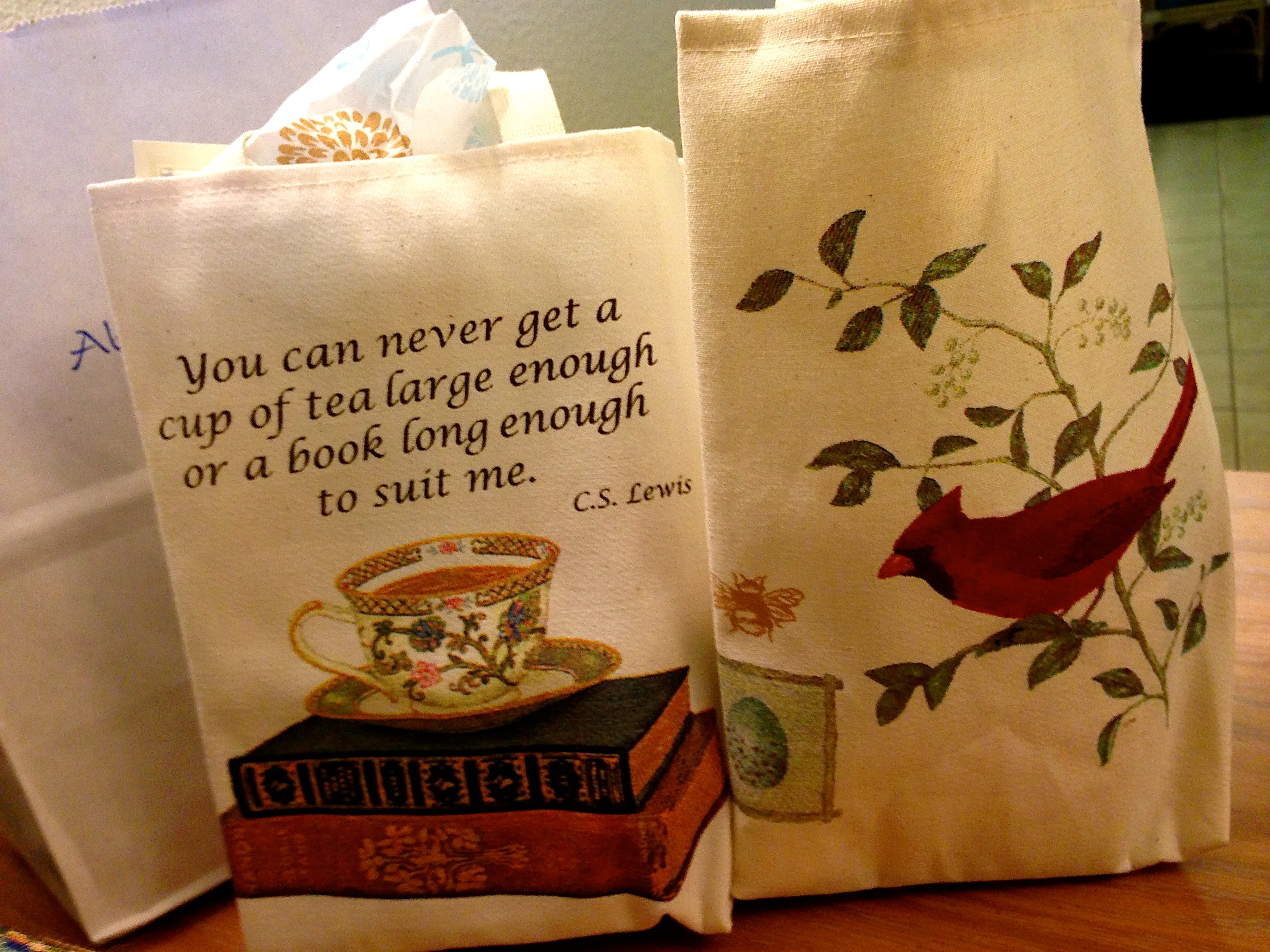 My bag is the one with the books and CS Lewis quote, and my candle is “Celtic Moonspice”. I wonder if I’ll ever burn it. Dad gave it to me!
