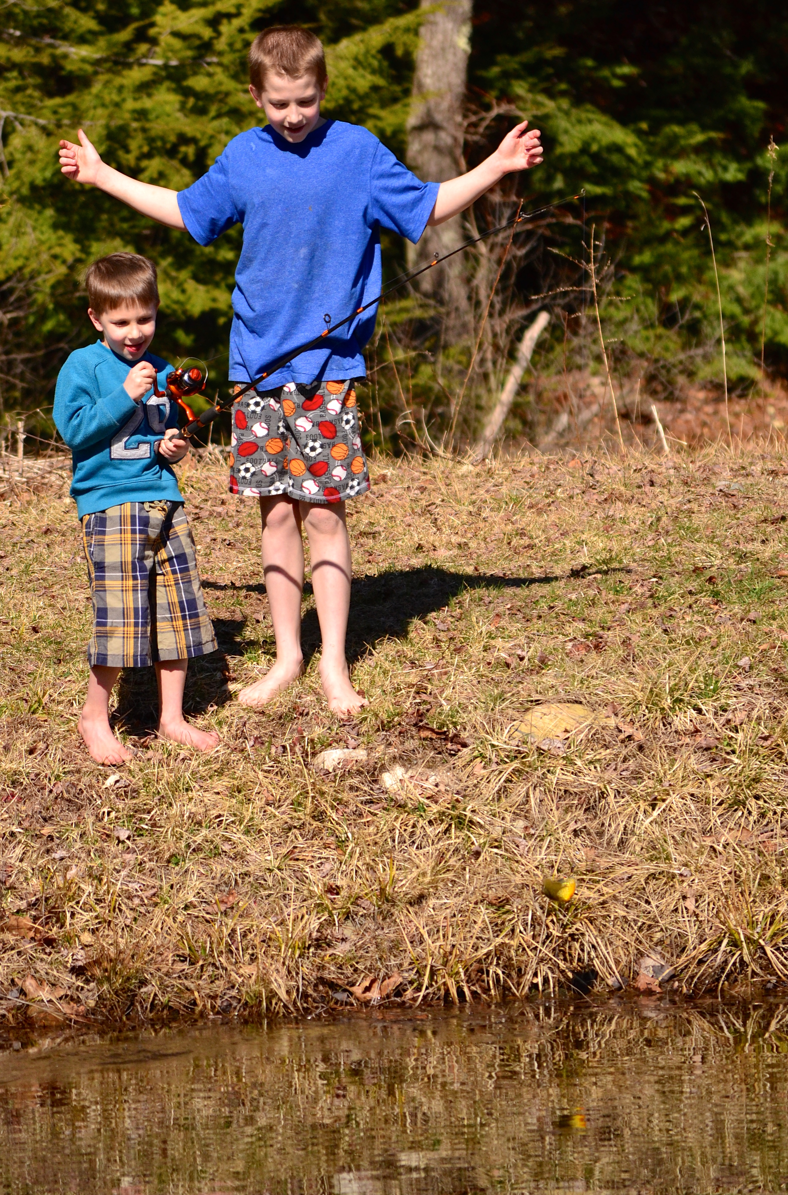 We spent some time outdoors this afternoon.  David got his fishing pole out, after noticing sunfish in the bass fish pond.  He said he had to get them out or they would eat the bass eggs this spring.