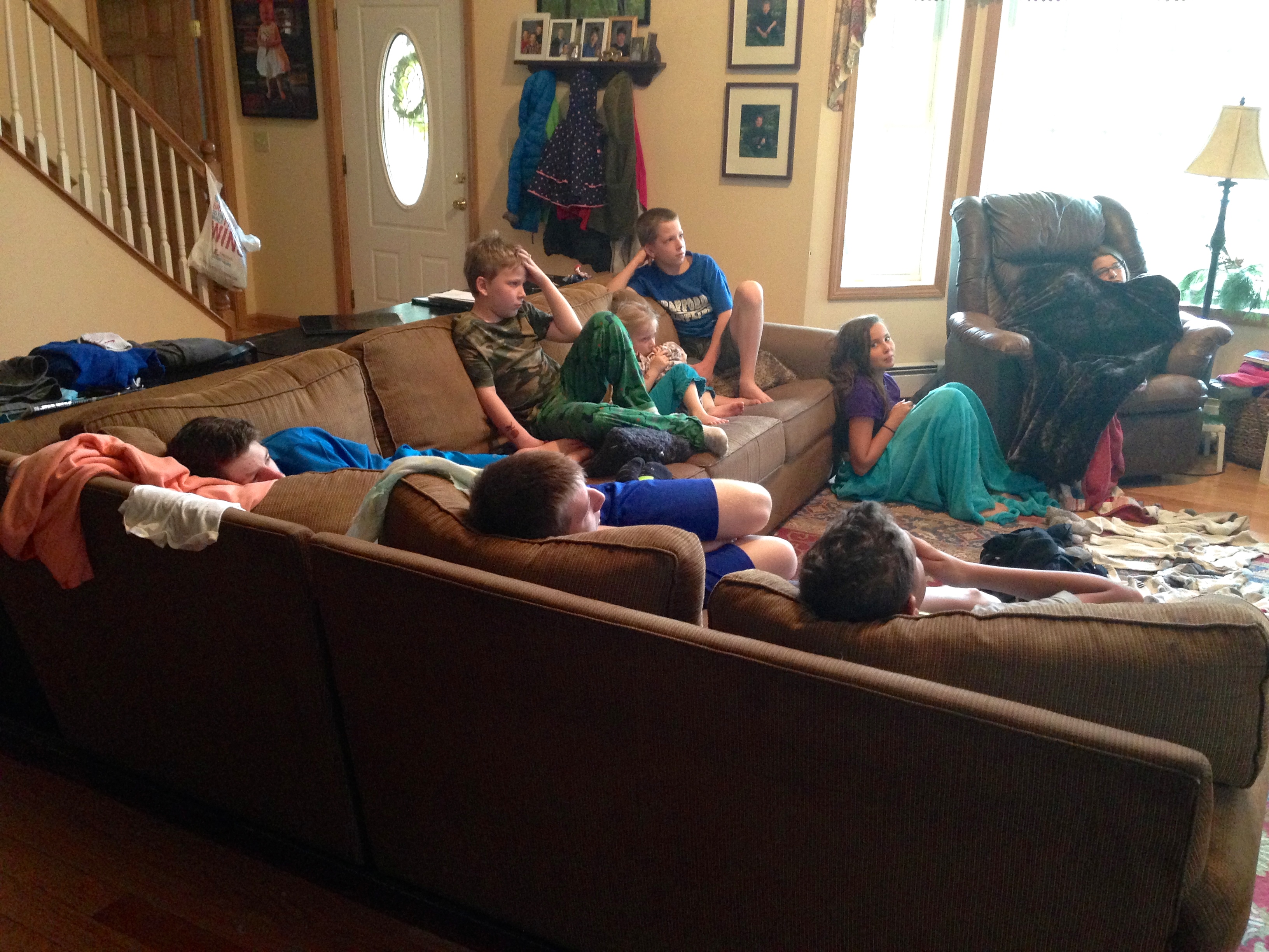 I went to bed around 10:30.  Ethan S and Caleb S spent the night; the kids all stayed up really really late.  I heard stories of Grace and Ethan S jumping in the pond at 10:30……and Myriah fell over wood while running in the dark and hurt her leg.  They were playing manhunt.