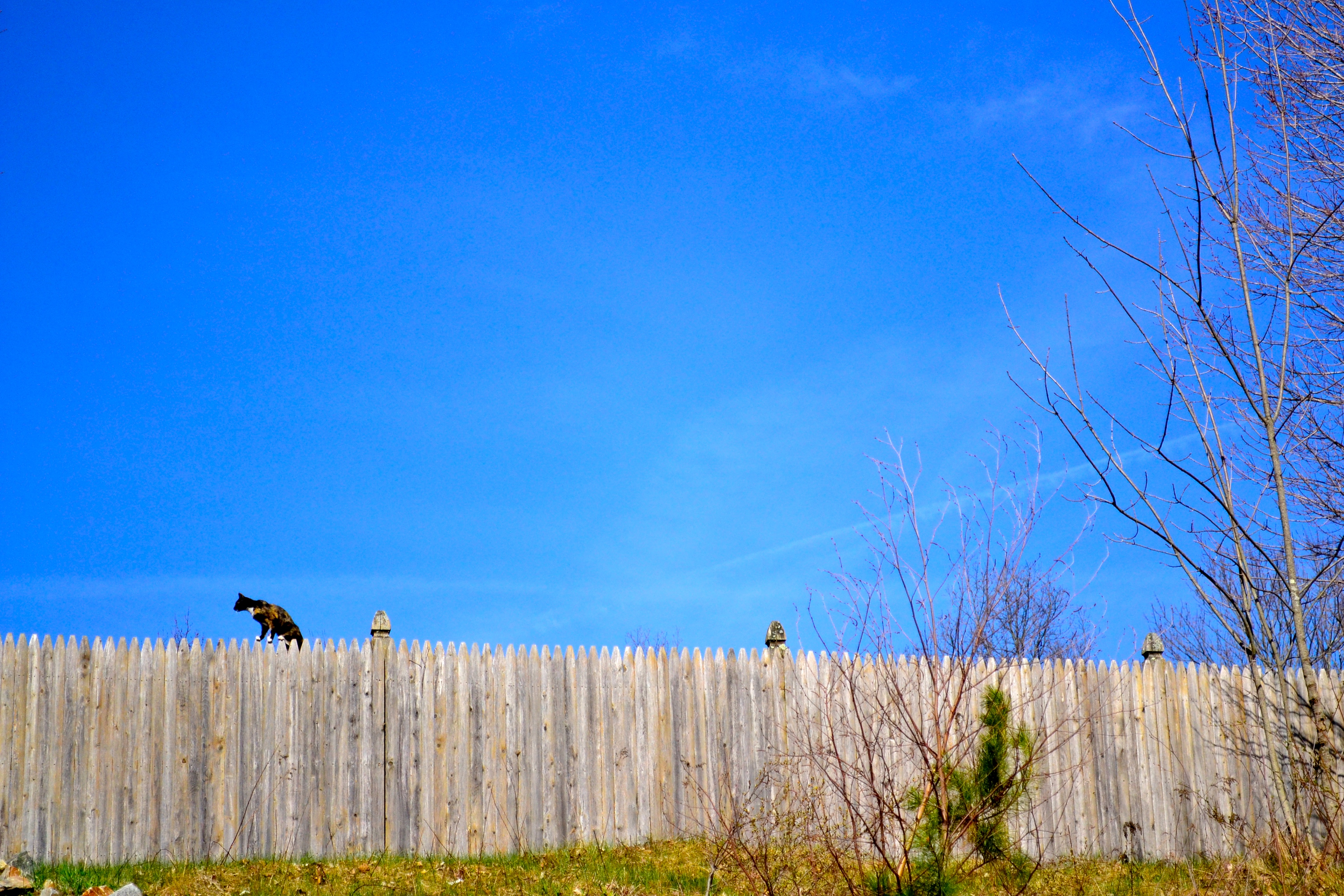 We spent time outside on Friday. It was a beautiful day. I found the children up on the hill behind the house exploring, and then Sammy jumped up on the fence from the neighbor’s side. She was exploring, too. Isn’t she pretty against the bluest of blue skies?