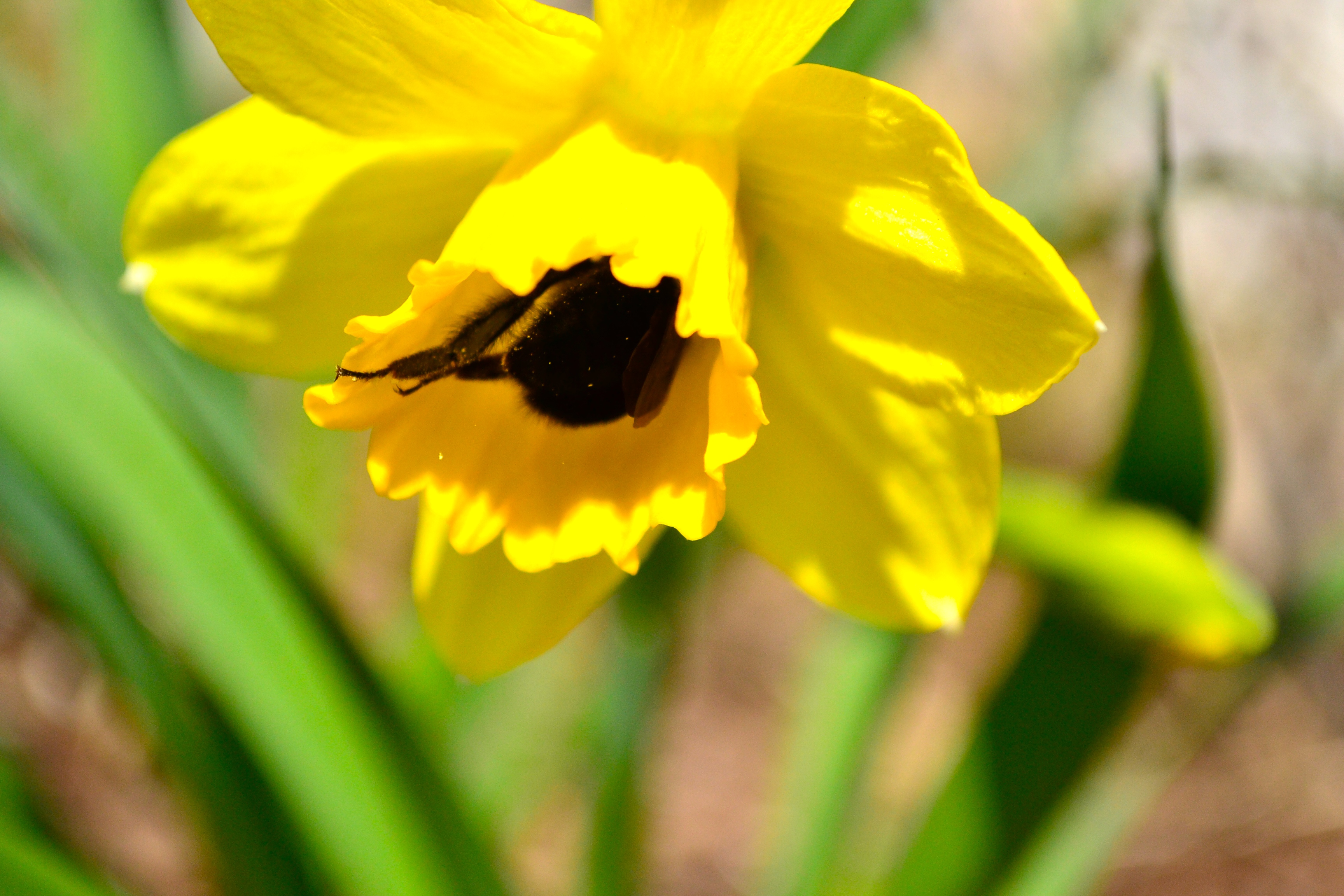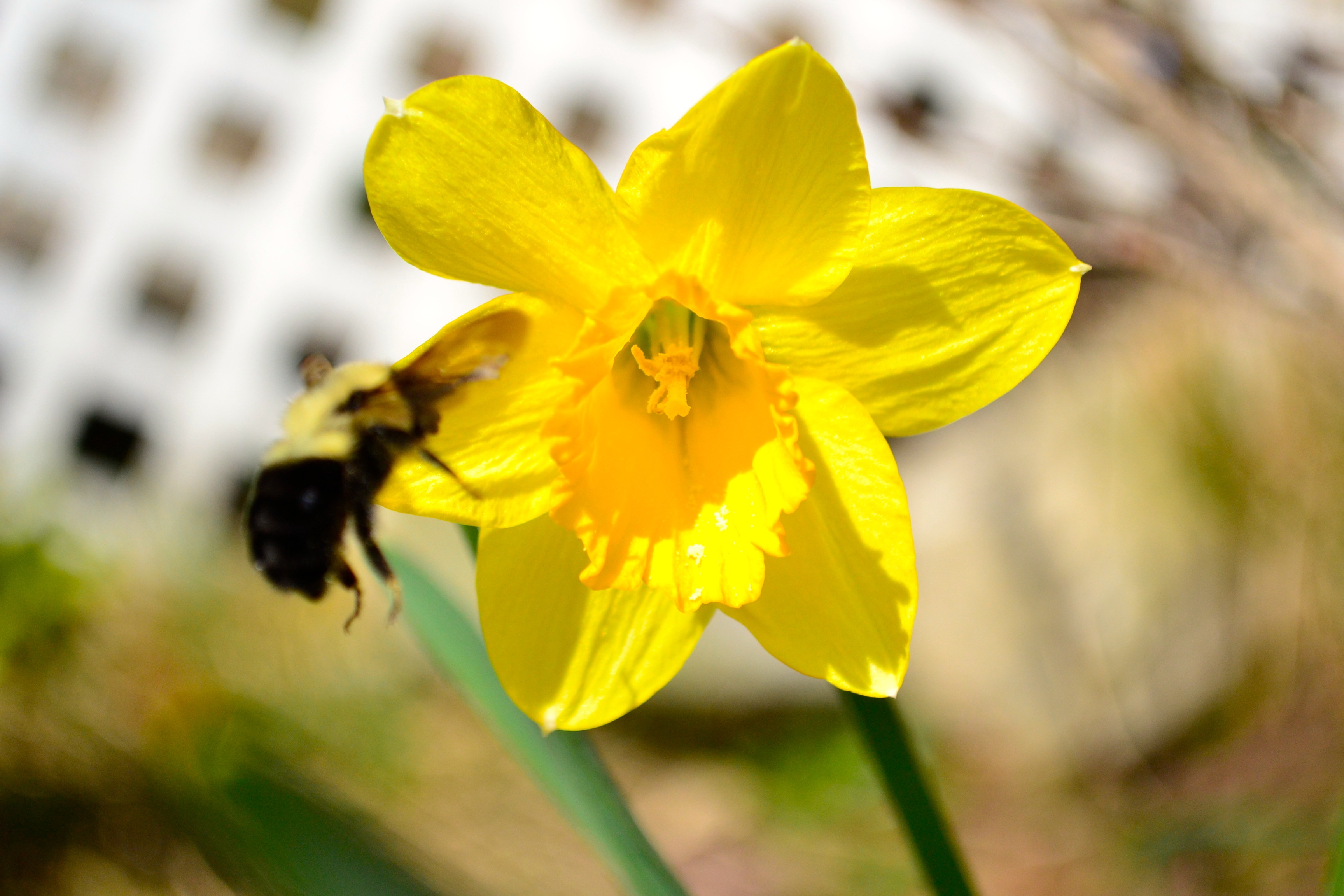 Daffodils are in bloom and the fuzzy buzzy bumble bees love them.