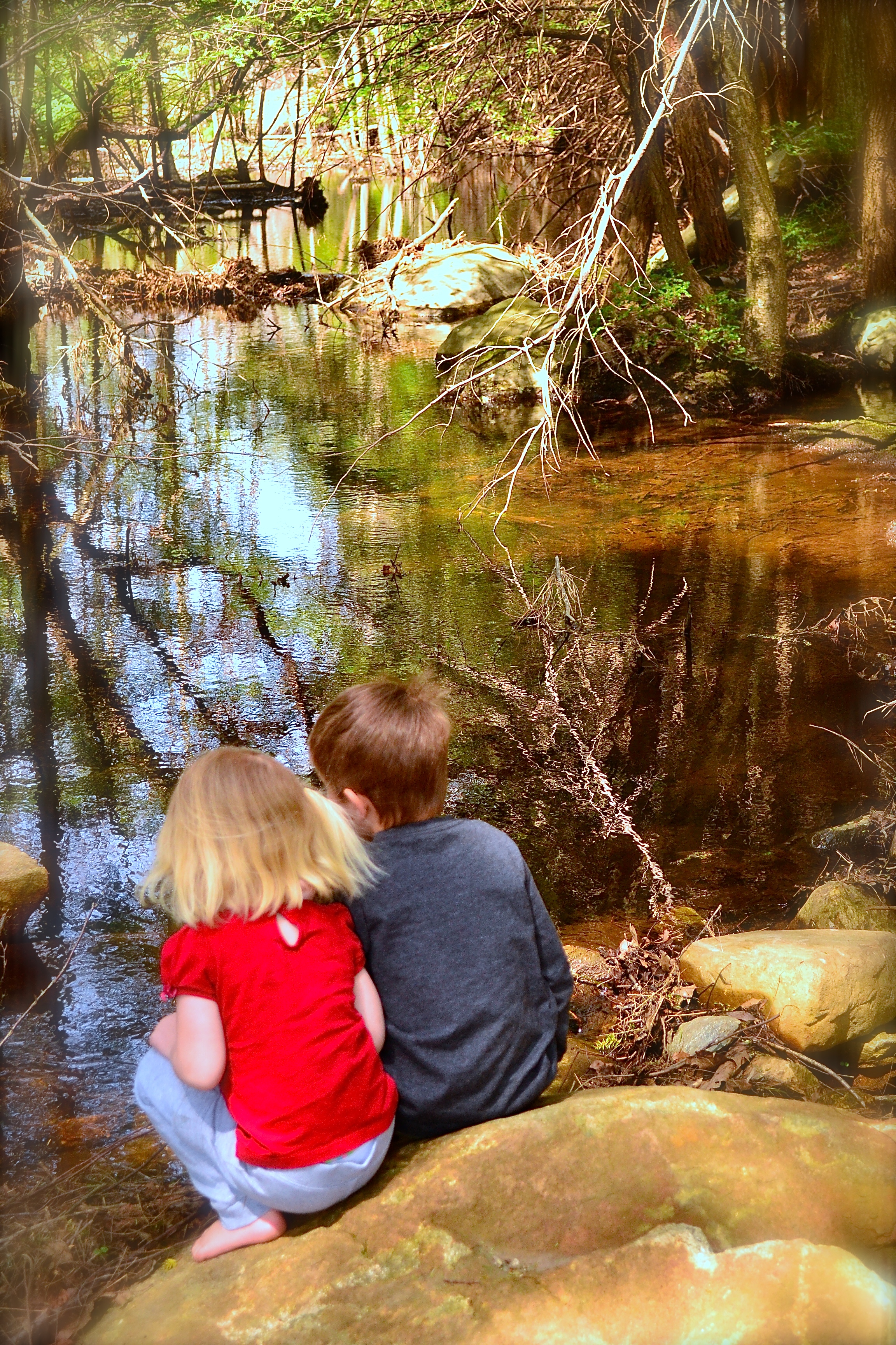 After throwing tiny pinecones into the long pond and watching the fish grab them and pop them back out of their mouths, we headed to the stream.