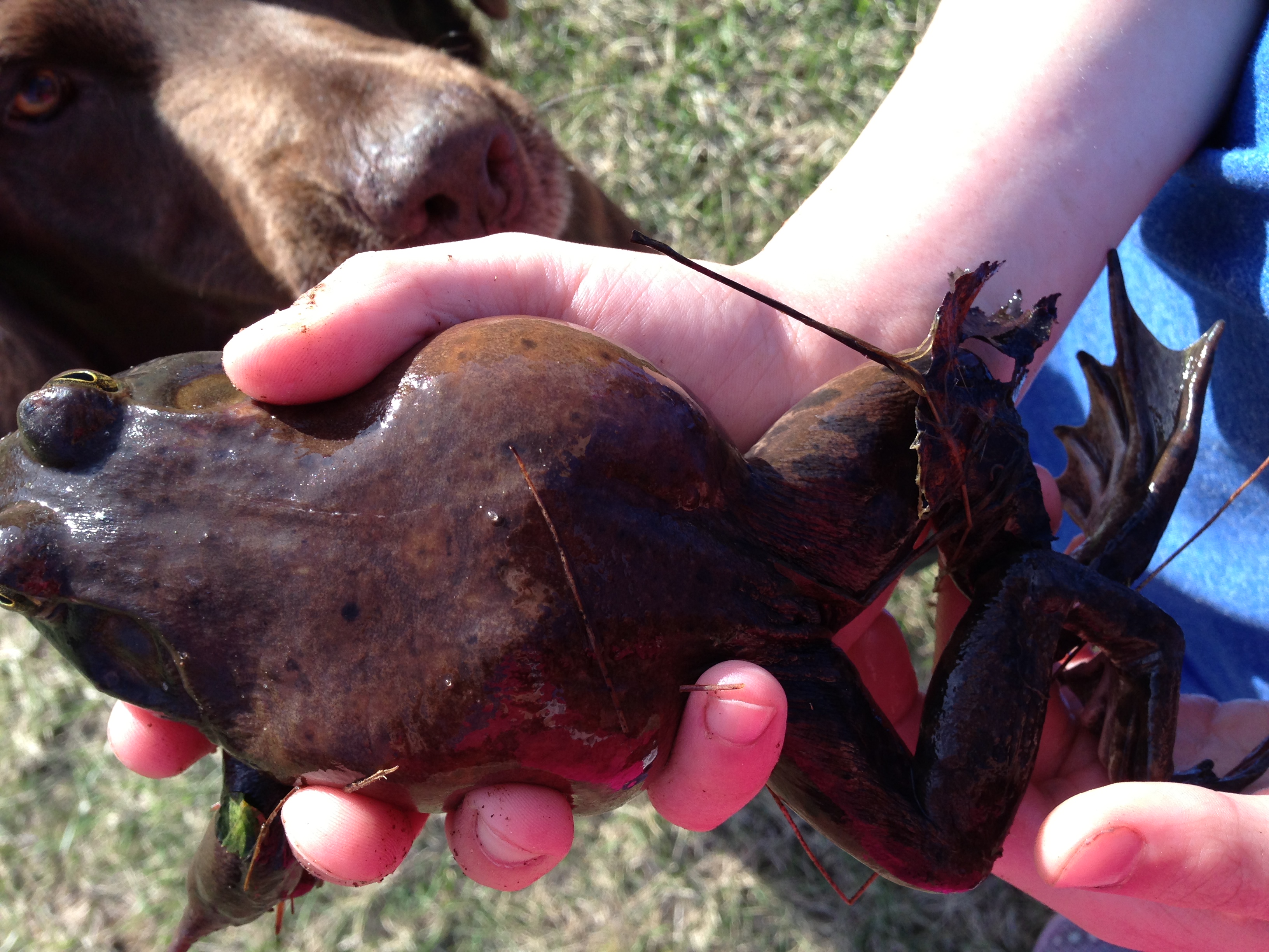 David caught a bullfrog out of the pond.