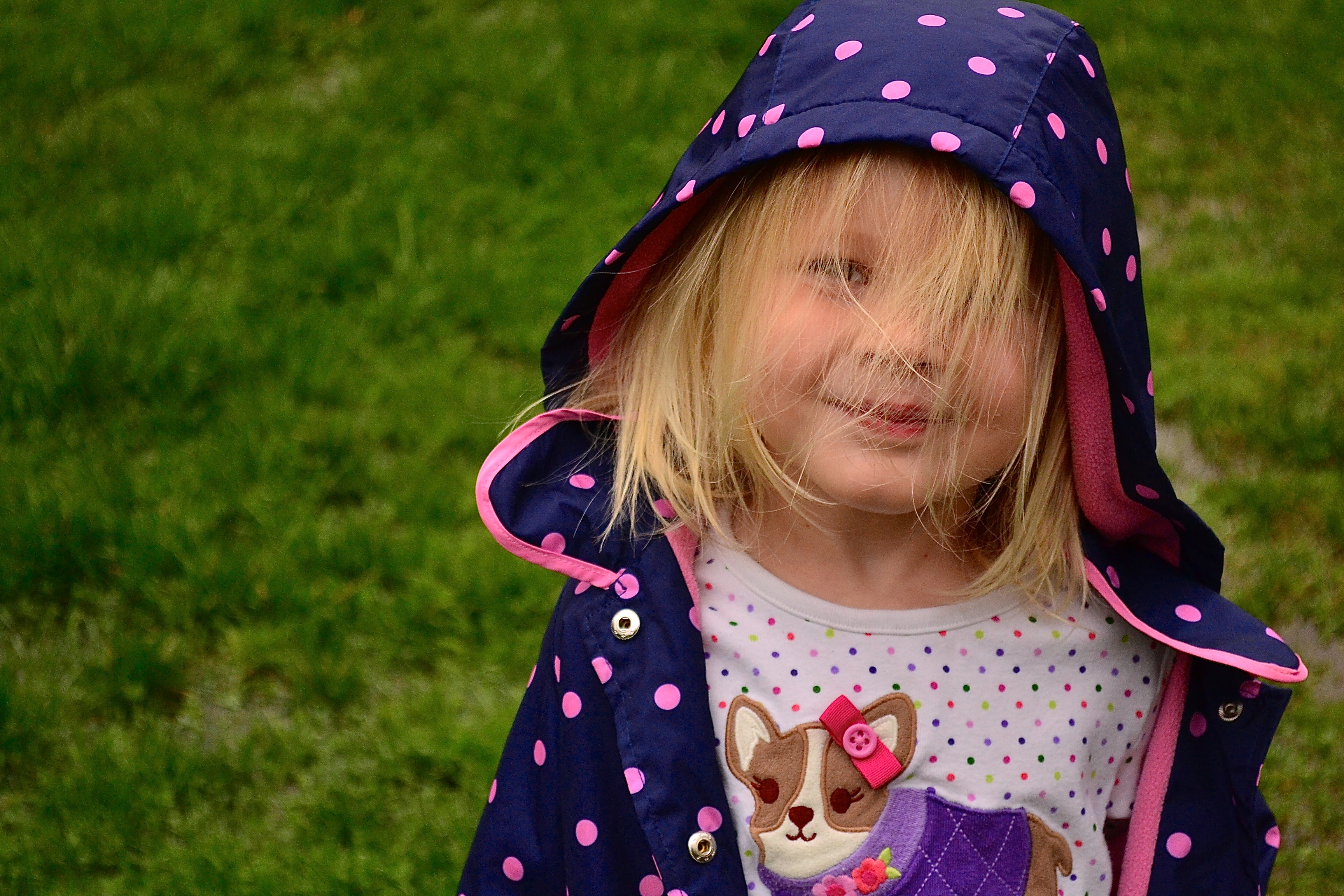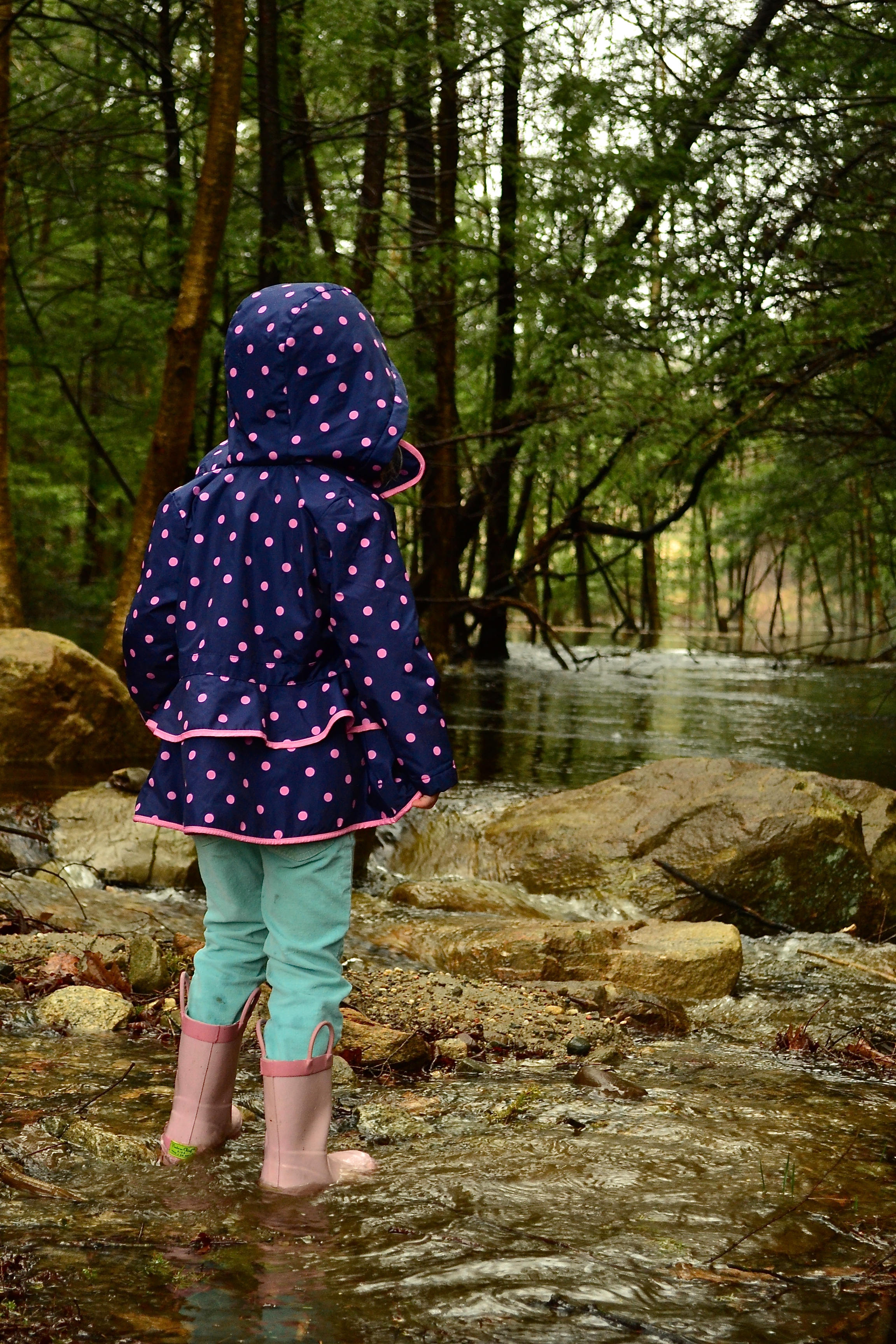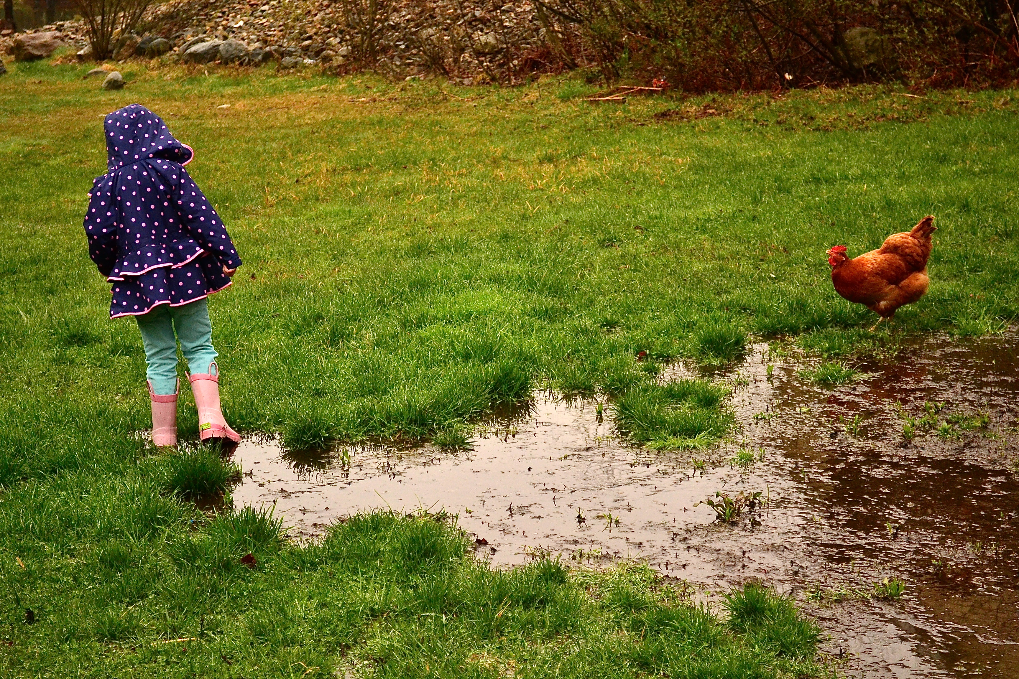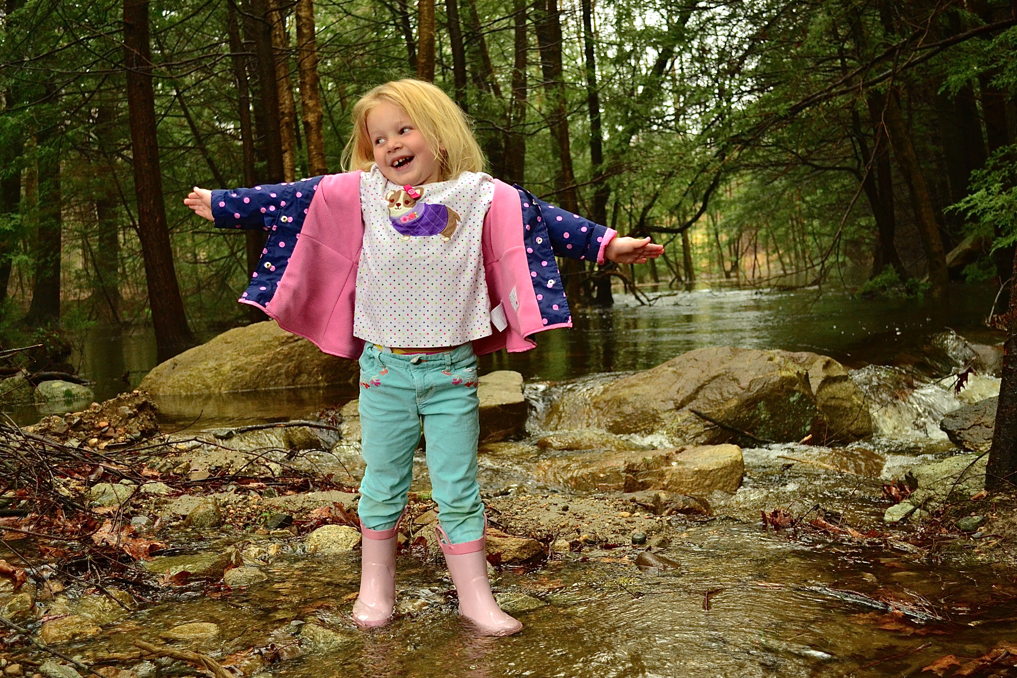 It is the first morning of May 2014.  Little Sarah went with me to the chicken coop wearing her pink water boots.   Oh, we had a lovely time.  There were plenty of clear, cold puddles for us to walk through, and a roaring stream to visit, too.