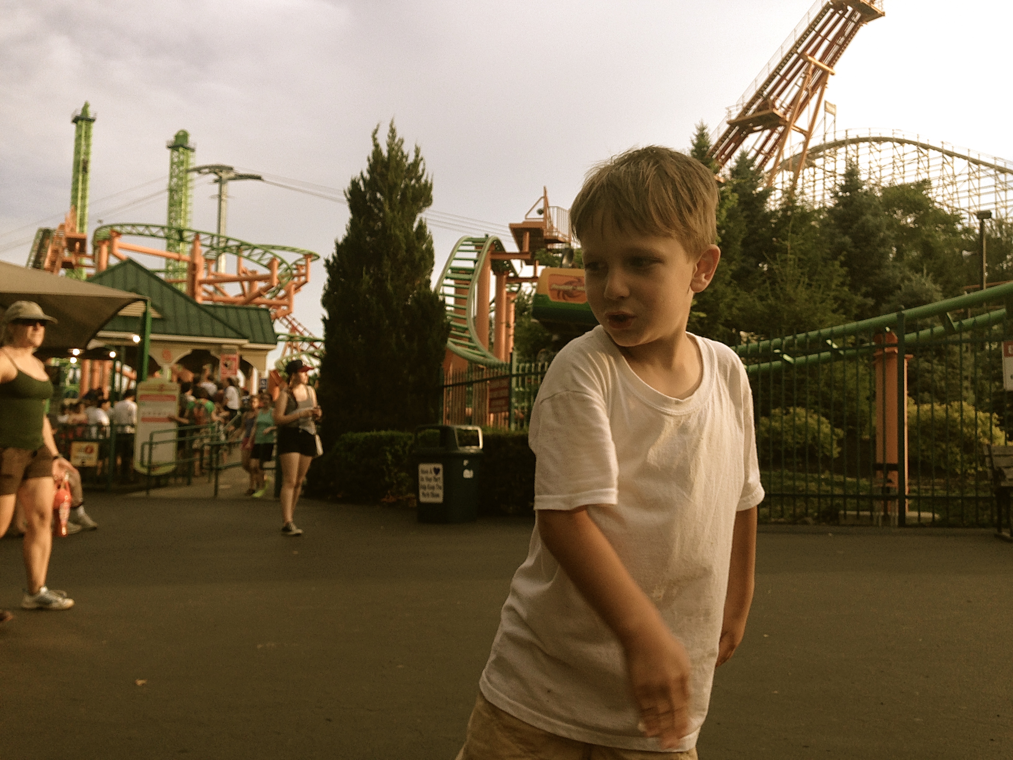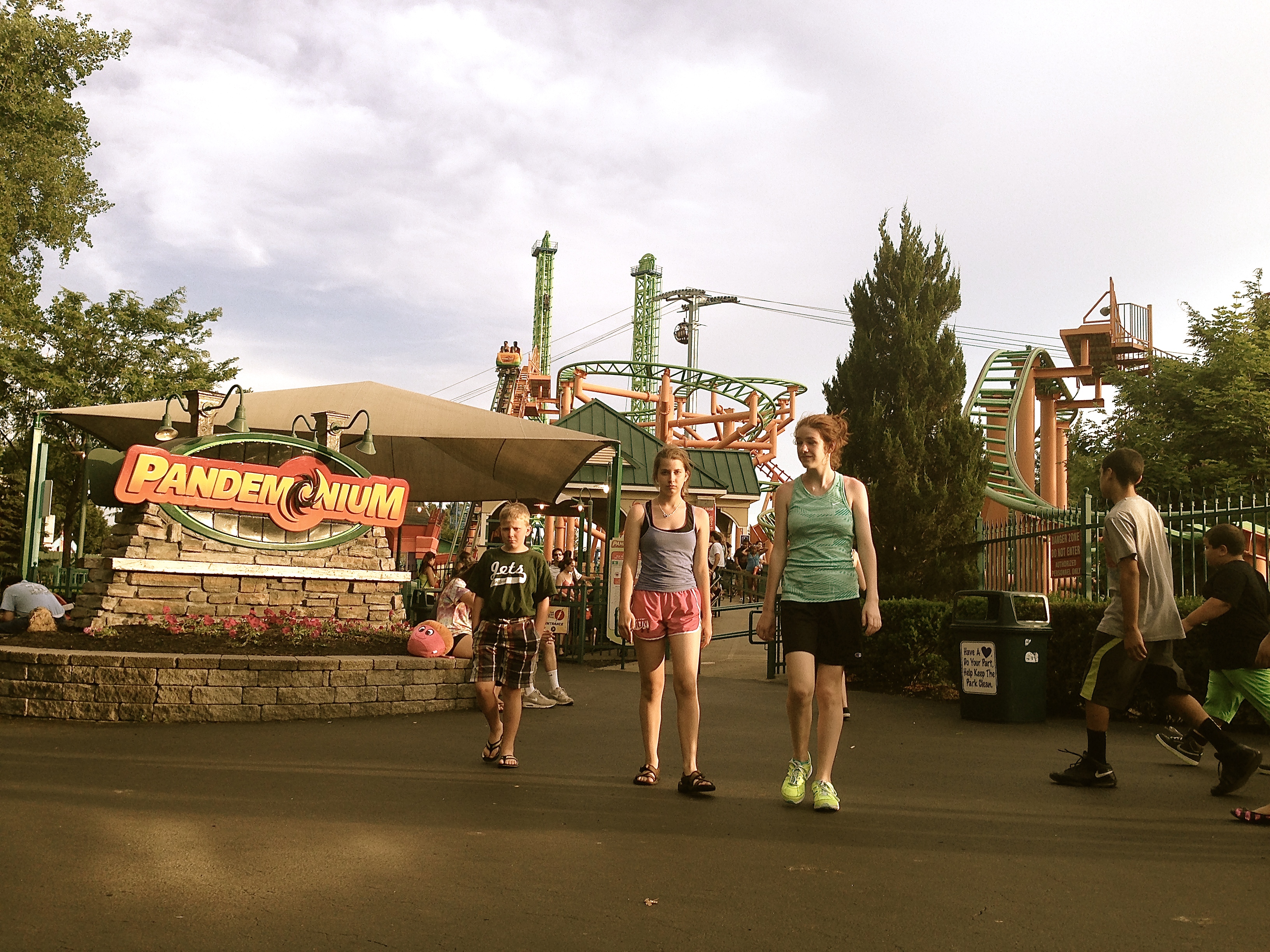 It was a hot day, but dry rather than humid, so we kept spraying on the sunscreen and away we went from one ride to another, to the water park, to more rides, and over priced soda and food, with which to sustain us. I also brought juice and fruit, and Amanda brought crackers and peanut butter.