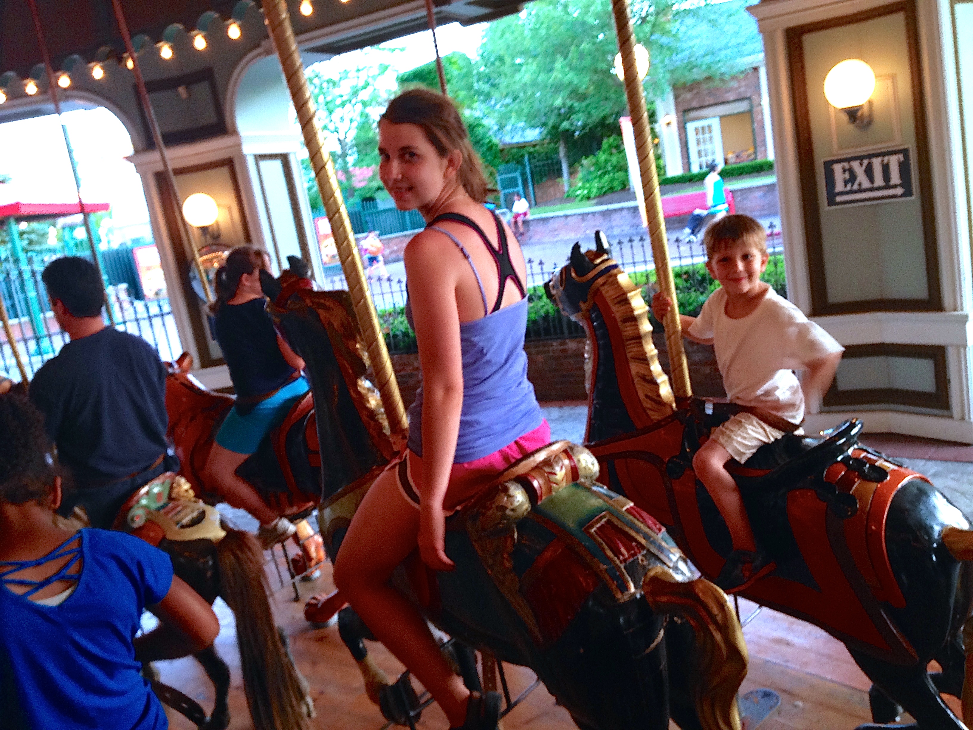 One last ride on the merry-go-round. After it started, Grace put her hands down and rode holding the horse with her knees, I could tell she was pretending it was real.