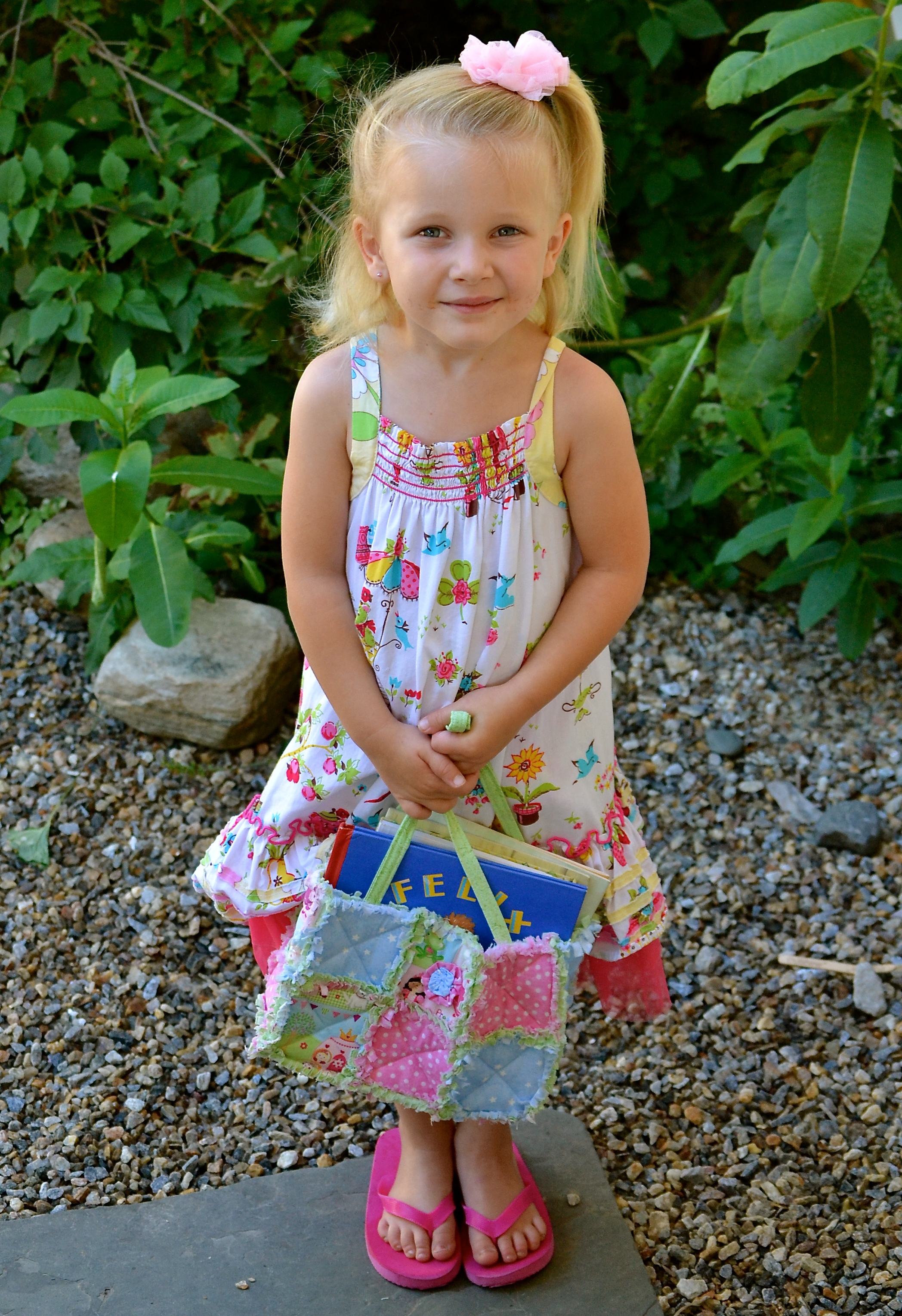 This is Sarah Joy yesterday morning, on her way to church with a book bag.  By the time we got back home she was feverish.