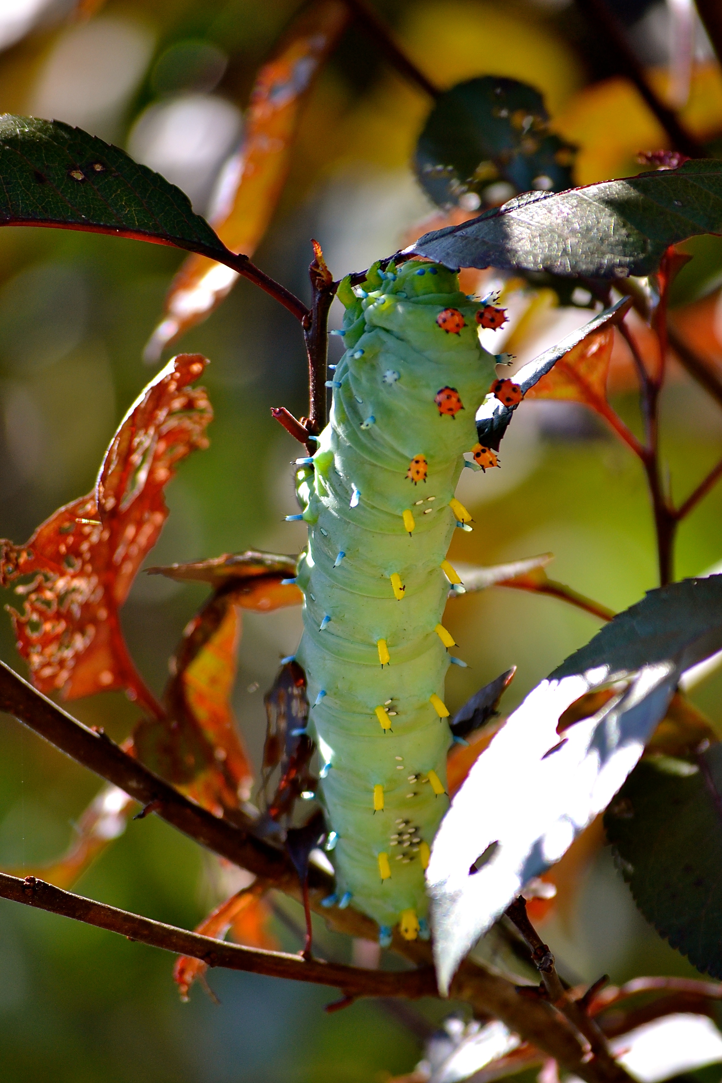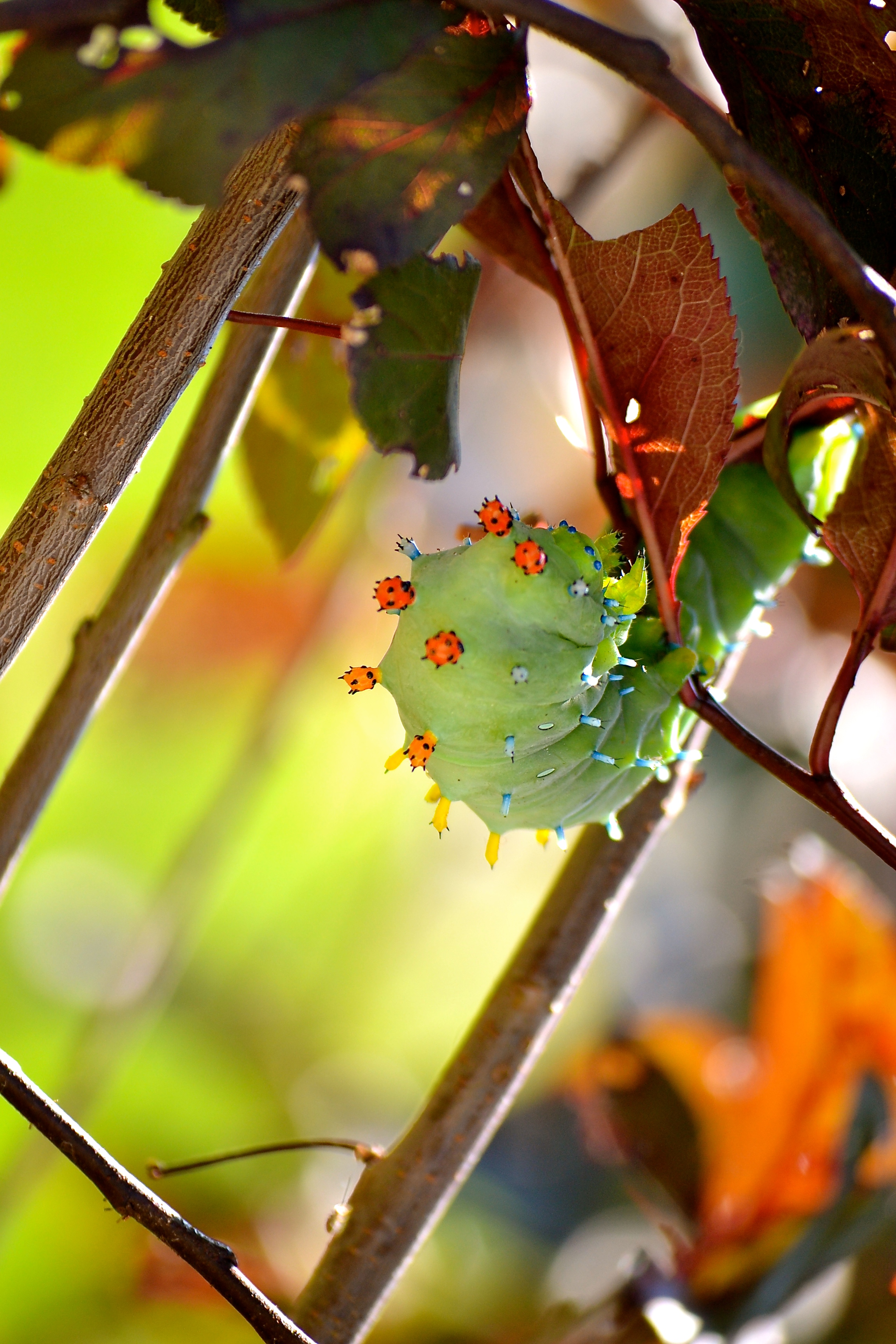 Jacob discovered a huge caterpillar in my garden.  It’s a Cecropia Moth caterpillar, it unfortunately has parasites on it’s back, so I don’t think it will survive, which is such a shame.  I had the honor of seeing a pair of these moths just after they hatched one spring.